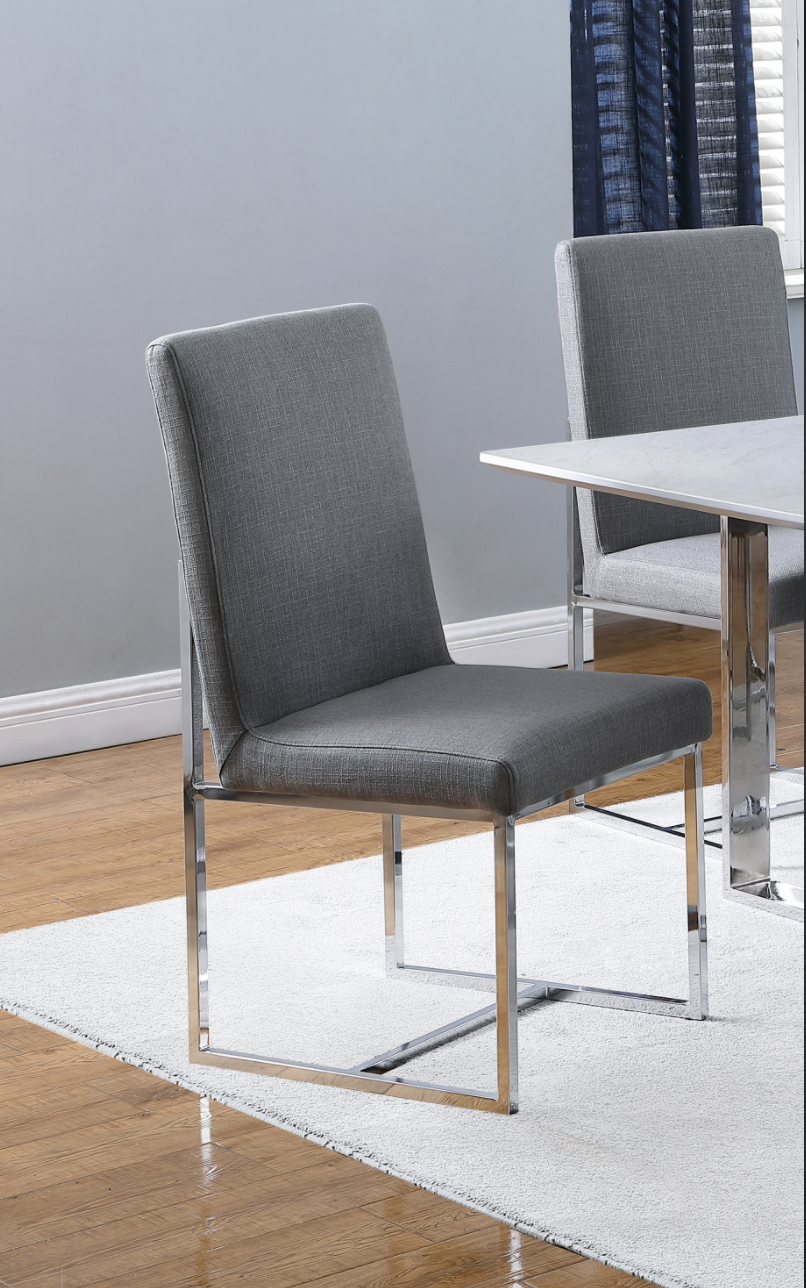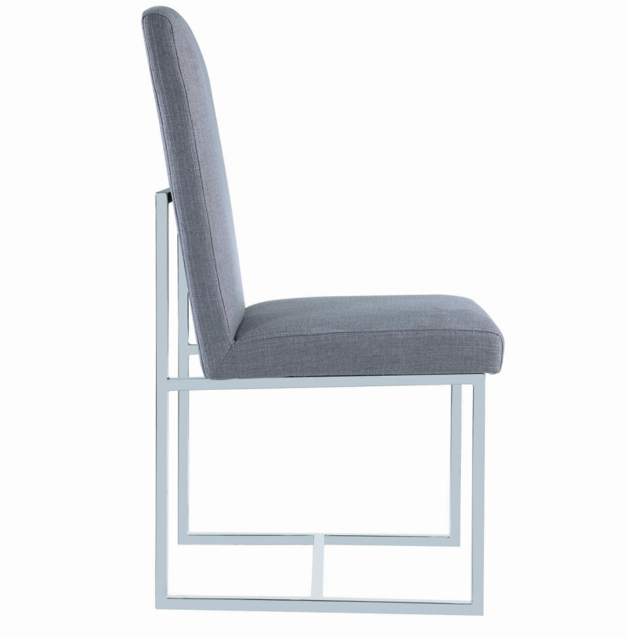 Fresh grey upholstery highlights the design-forward look of this dining chair. Bring comfort and classic styling to a glass or wood table. A high back with linear design elements offers minimalist, elegant aesthetics. Creating balance, its open-concept geometric frame and leg base wrap up a fashionable design package. Make this exceptional chair part of a tasteful dining ensemble.