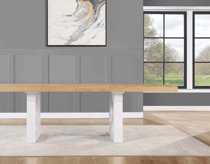 Large scale and generous proportions define the silhouette of this instant Modern Farmhouse dining table classic. A naturally finished top highlights the character and grain of the oak veneers and complements the substantial but refined white double pedestal base. This 72-inch long table fits in most dining room but scales at an instant to 96 and 108-inches to seat up to 10 guests easily.