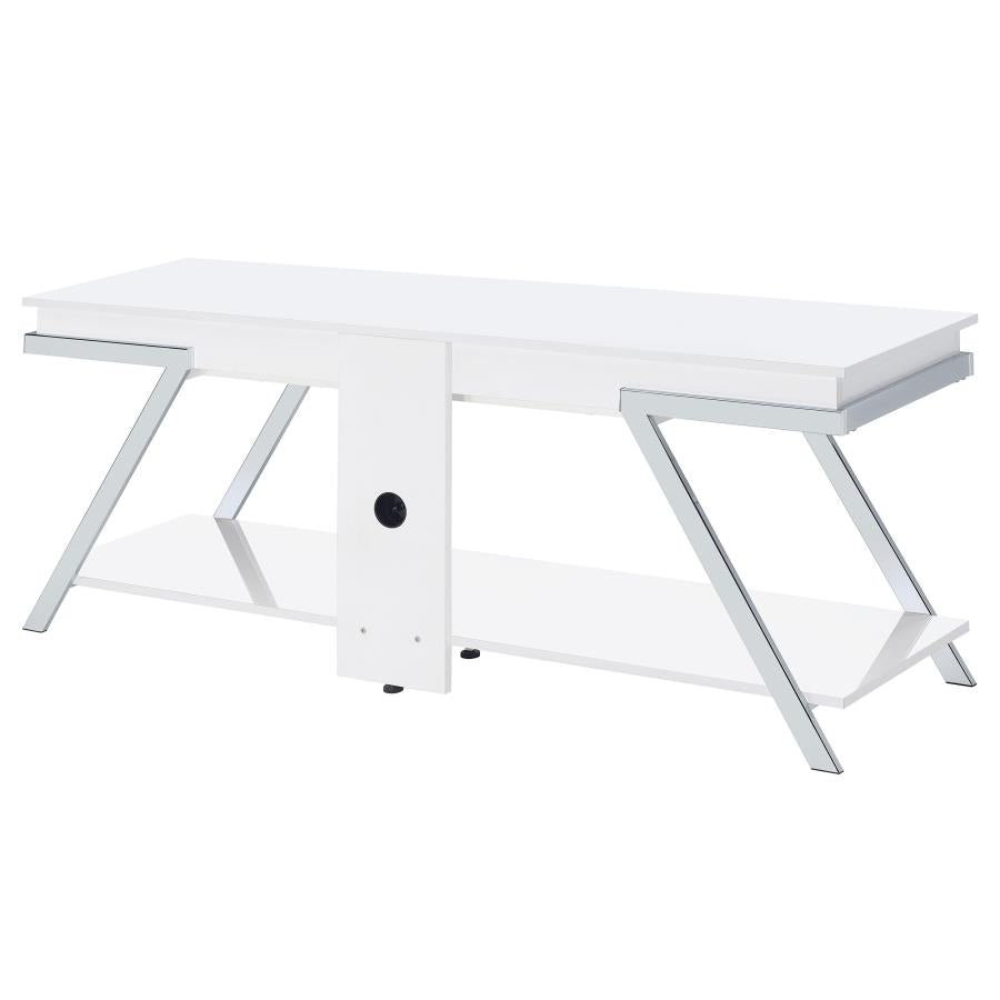 Fresh, inspired design turns your casual home into a haven for easy style with a novel design in a TV stand. Prep a media or entertainment room with this ultra-contemporary TV stand made of white high gloss finished MDF with paper coating. Angular metal framing adds a cool aesthetic boost. A modular-like configuration and aesthetic works well in updated casual rooms, with a spacious upper surface and lower shelf. A single center drawer stashes incidentals.