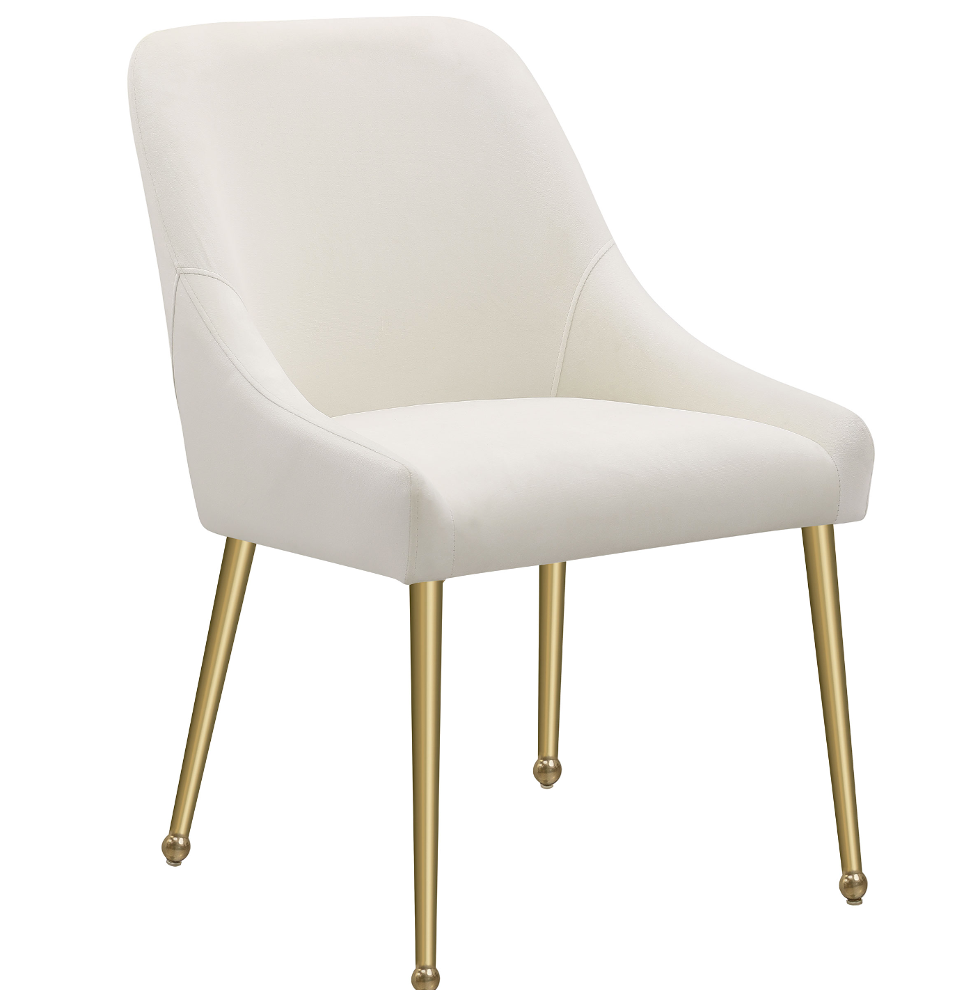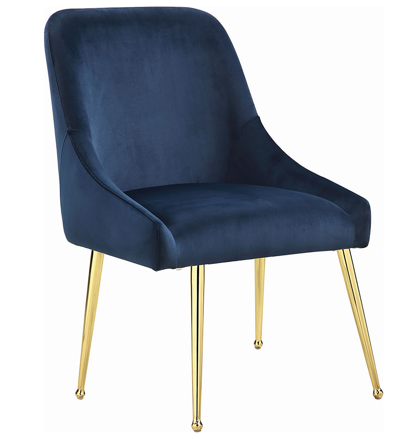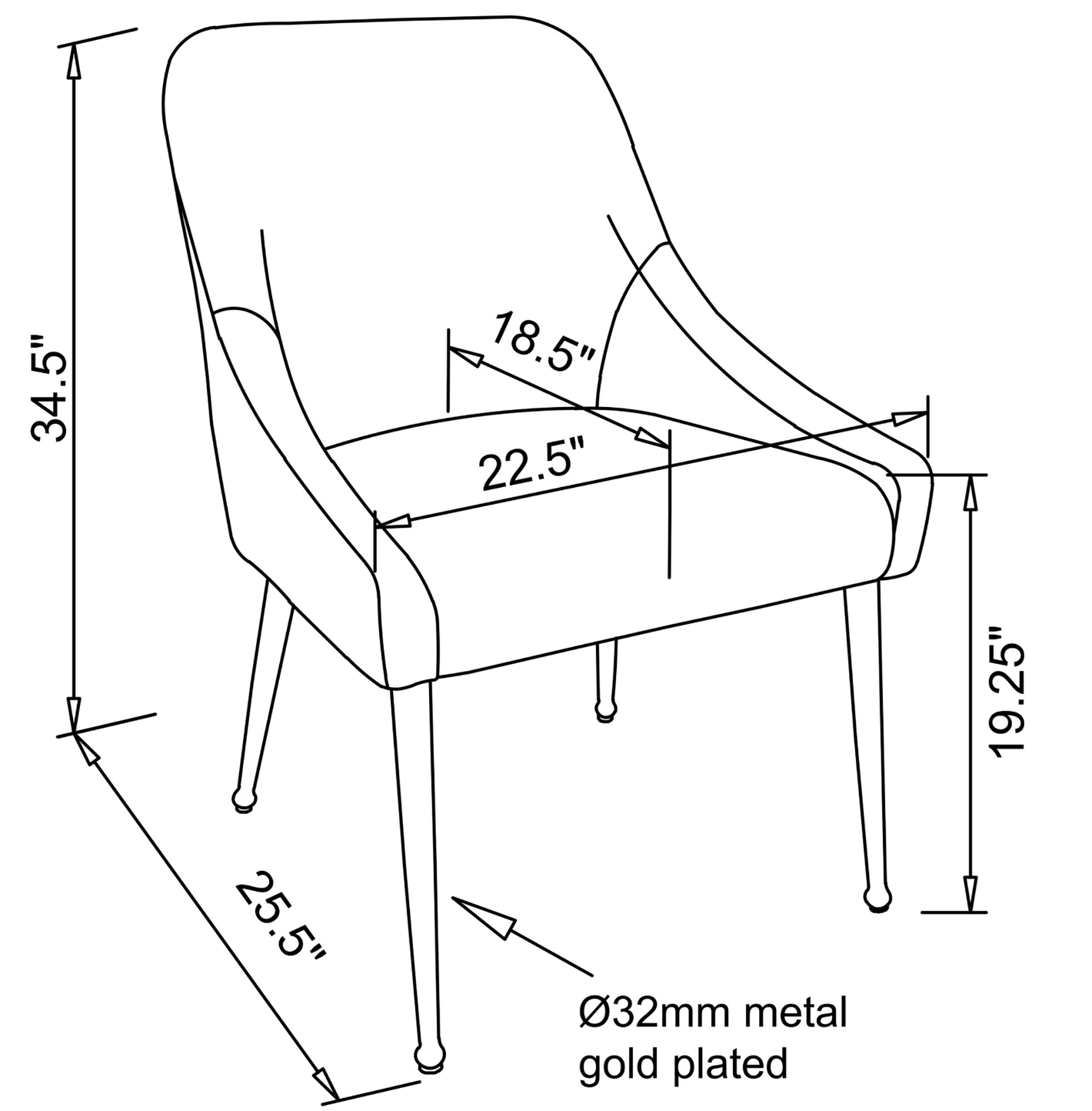 Cradle yourself in the embrace of opulence with this Italian style modern dining side chair, where comfort meets sophistication. Its gold metal legs, tapering into geometric spheres, create a foundation that's as sturdy as it is striking. The seat, a haven of luxury, boasts sloped arms and plush cushions that beckon you to linger longer after the meal has ended. A purposeful handle on the chair back not only adds to the aesthetic charm but also serves in practical motion, inviting ease with a touch of elegance. This chair is a statement piece, ready to elevate the dining experience and infuse your space with a blend of retro inspiration and contemporary flair.