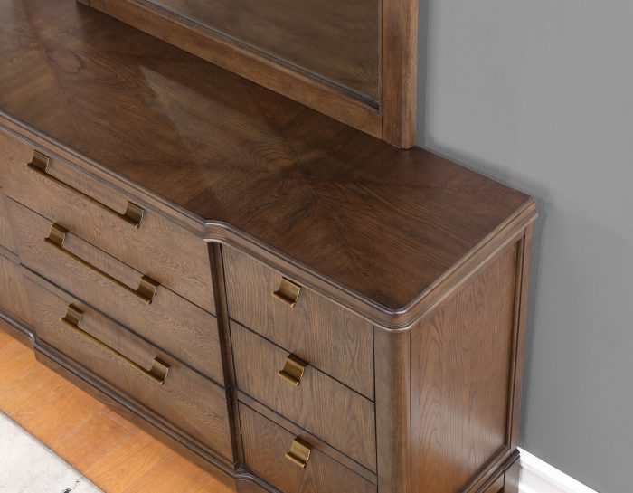 Modern bedroom styling in a Dresser constructed with the craftsmanship you will appreciate. The six-drawer Milan Dresser features a warm brown walnut-colored finish accented by the contemporary sloped hardware finished in an antiqued bronze color. The modern breakfront face features an opulent sunburst veneer pattern and side-drawer glides for whisper smooth drawer operation. Paired with the Milan Mirror for the perfect setting to get ready for your day!