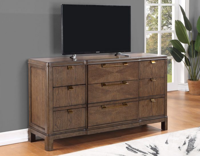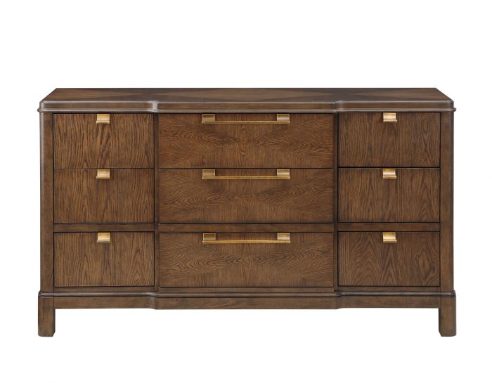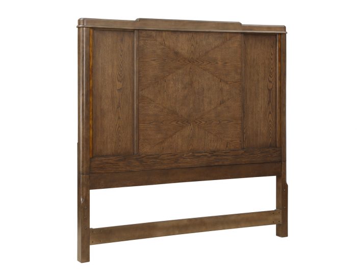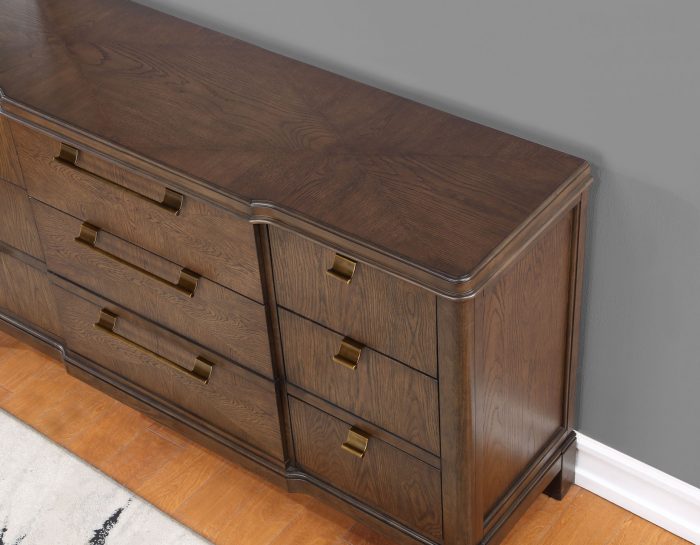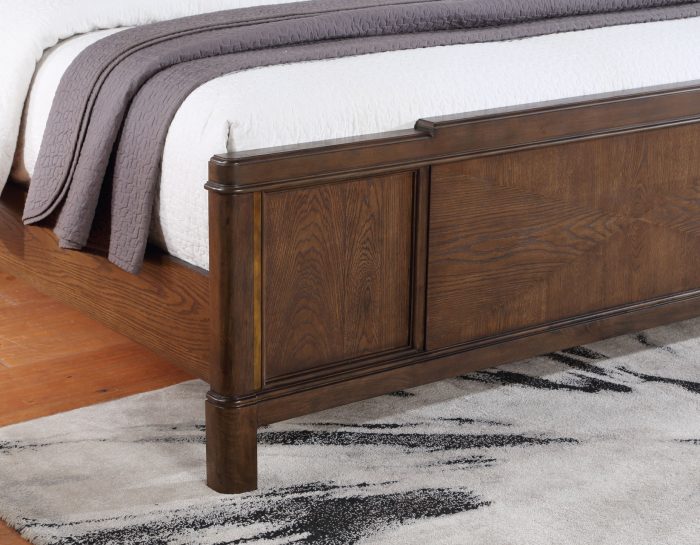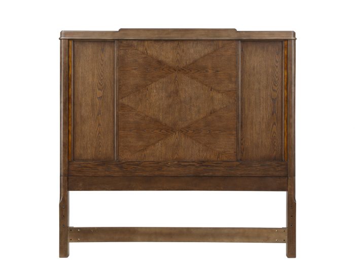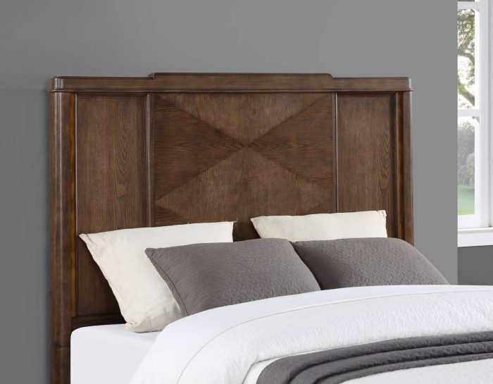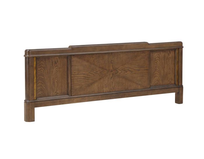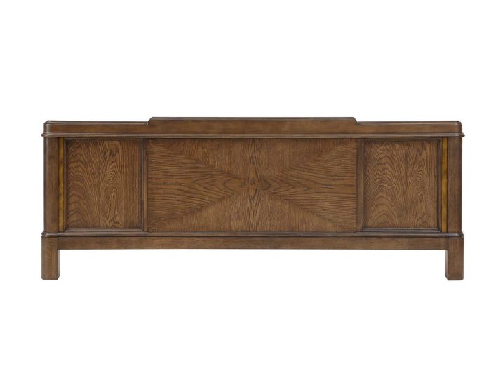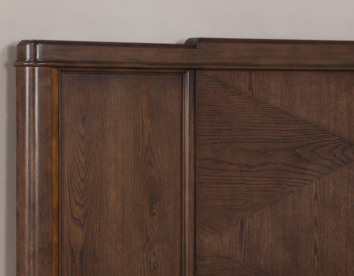 - Styling details include modern breakfront case, sunburst veneer pattern on drawer fronts and headbosrd