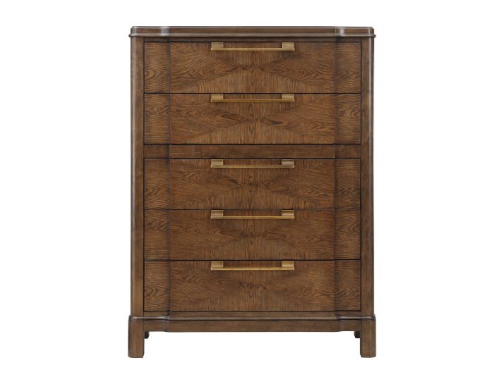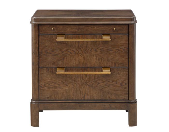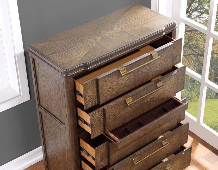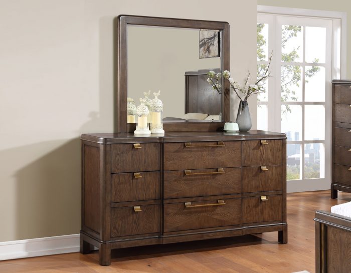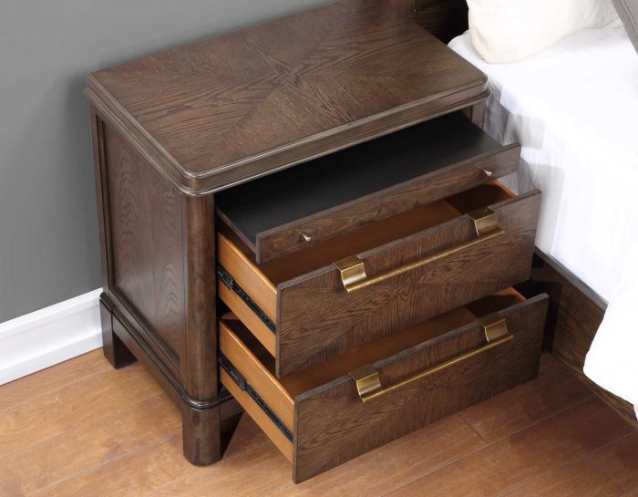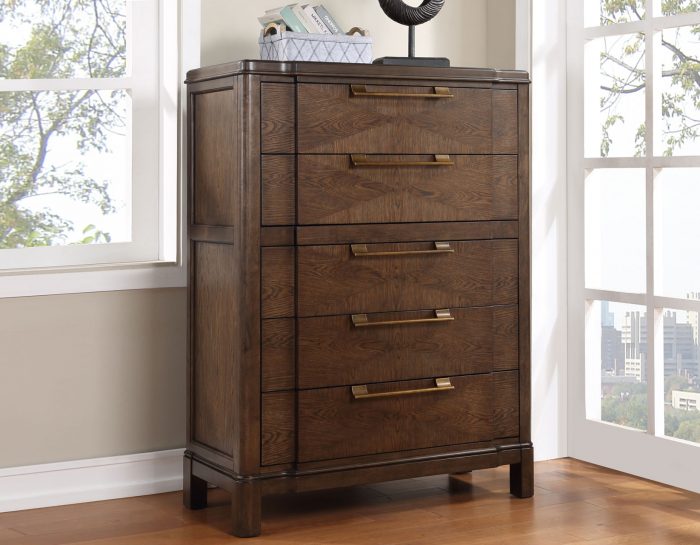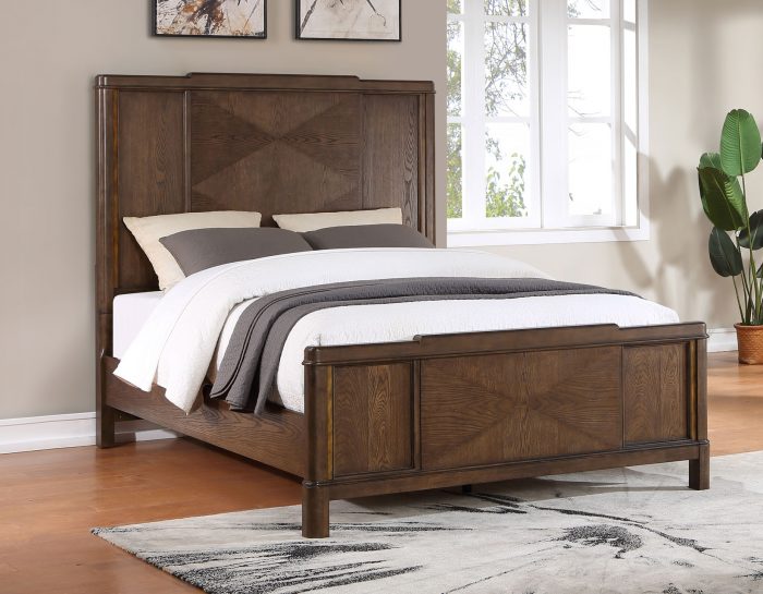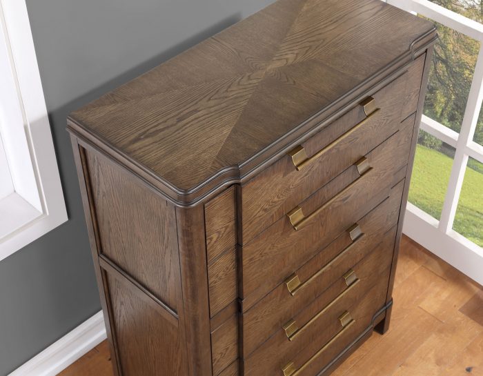 Modern styling in a Bedroom set constructed with the craftsmanship you will appreciate. The Milan Queen Set features a warm brown walnut-colored finish accented by the contemporary sloped hardware finished in an antiqued bronze color. The modern breakfront face on case pieces features an opulent sunburst veneer pattern and each piece has side-drawer glides for whisper smooth drawer operation. A modern take on classic styling, Milan will update your bedroom in a hurry!