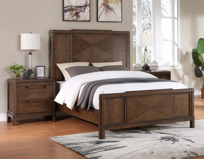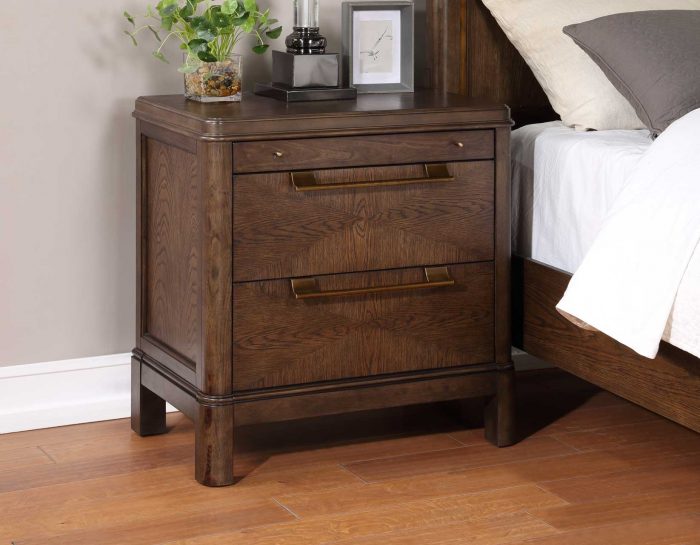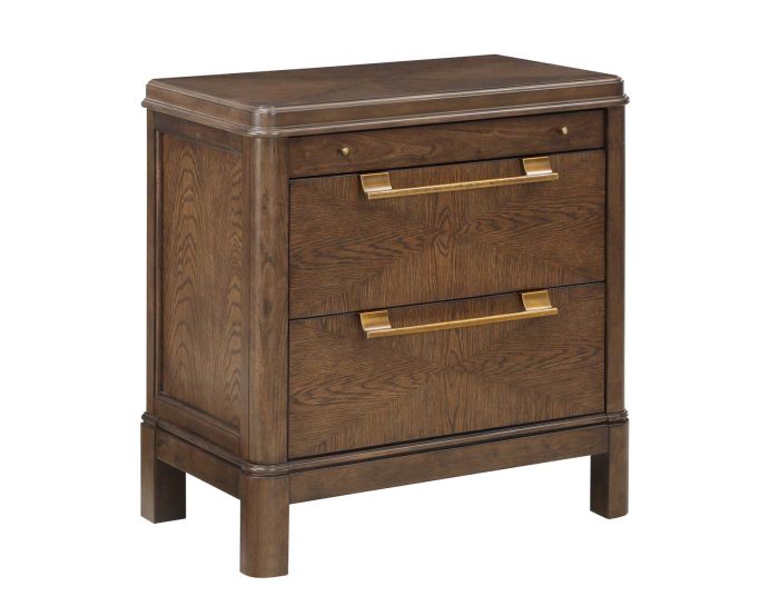 Modern style in a warm brown walnut finish, the Milan Nightstand will make a trusty bedside companion. This piece packs a lot of design in a small footprint with sunburst veneer fronts, a reverse ogee top, and a handy pull-out shelf for glasses or beverage storage. The antique bronze hardware adds additional warmth to this updated take on contemporary design.