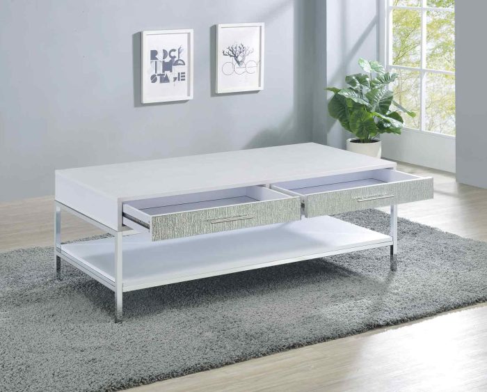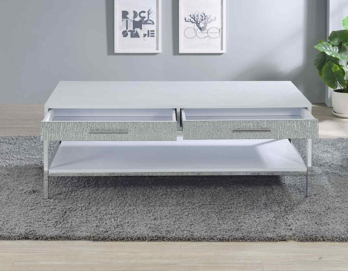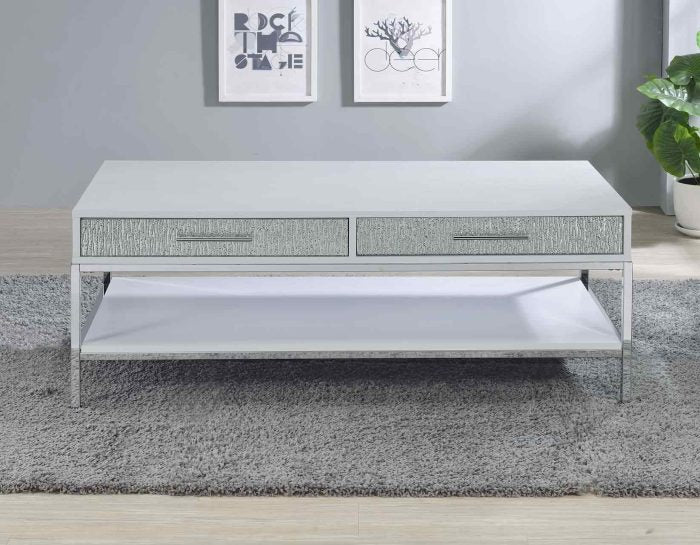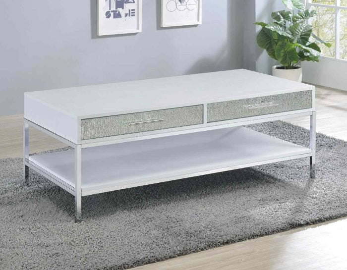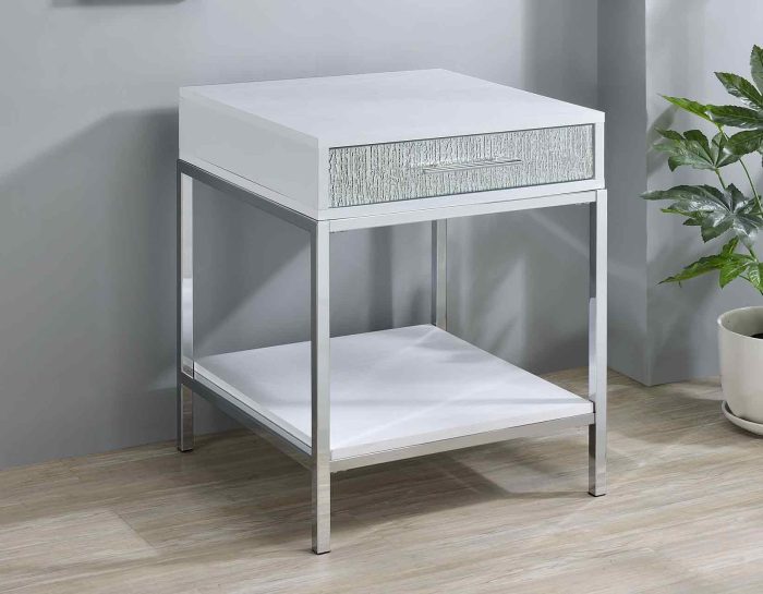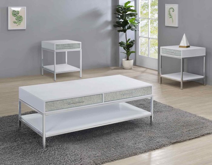 A dazzling collection of tables, Mirage delivers contemporary glam styling in this beautiful 3-piece set. White finishes combine with mirrored drawer fronts and chrome legs in tables that glimmer and sparkle in available light. Function is also important and Mirage features storage in every piece with drawers and doors to help keep everything organized.