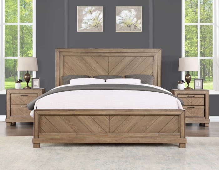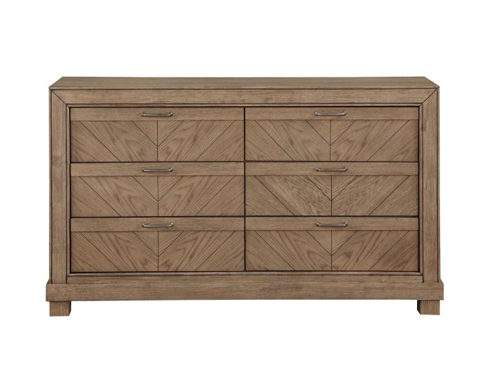 Primitive rustic design meets California Casual style in this rustic, yet refined bedroom set. Montana is finished in a Weathered Sand stain with oil-rubbed brass hardware in a relaxed aesthetic for casual bedroom decors. The Montana King Set is anchored with a chevron pattered Bed and Dresser with fully extendible deep drawers and felt-lined top drawers for plenty of space-optimizing storage. This 4-piece collection comes with a King Bed, Nightstand, Dresser and Mirror. Use as is or add the optional Chest for even more storage.