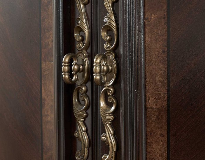 - Styling details include antiqued brass hardware, felt-lined top drawer with shaping on case pieces, metal and gold leaf accents on base rail, top rail and bun feet