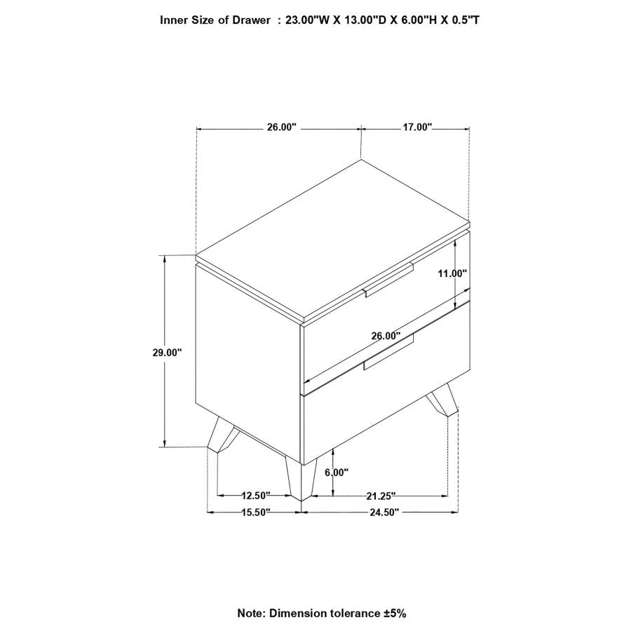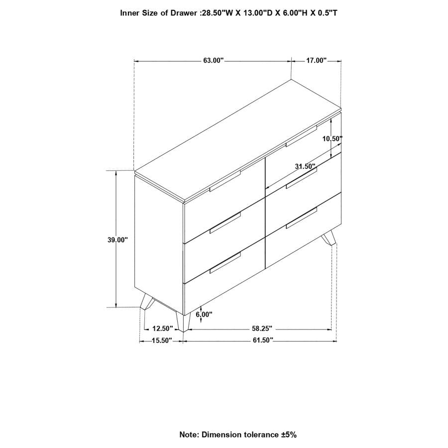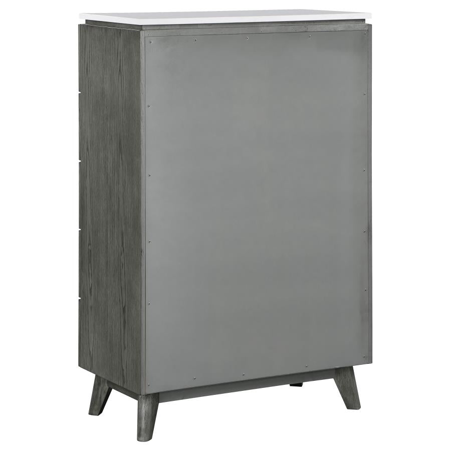 Transform your bedroom into a modern and chic space with this contemporary collection. The neutral grey finish accentuates the wood grain, while the contrasting copper pull handle hardware and dramatically angled legs provide striking design elements. All case pieces feature a marble top, making this collection a perfect addition to your modern bedroom décor.