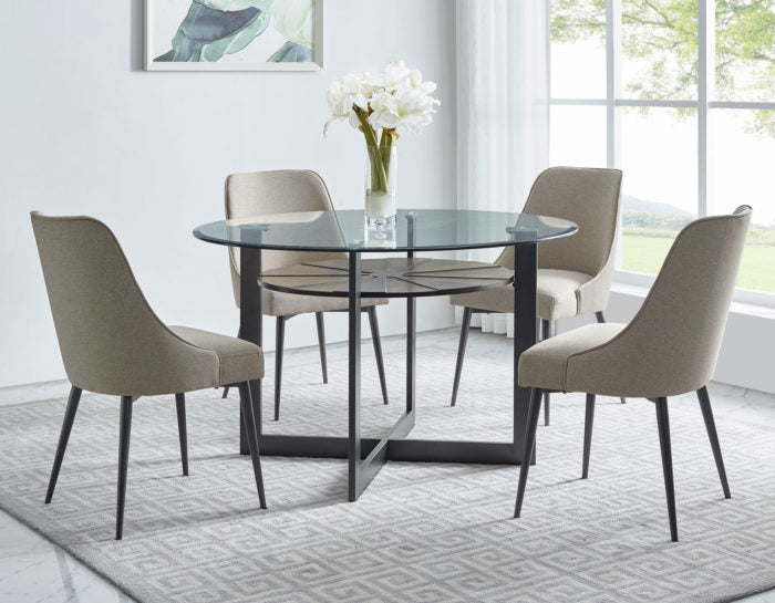 Step up to the latest in mid-century design with Olson dining from Steve Silver Company. Sleek fabric Side Chairs offer a comfortable and stylish accent to the 48-inch round glass top dining table top in a collection that will add a touch of class to any dining area. The Side Chairs are available in khaki fabric and feature iron legs as does the table.