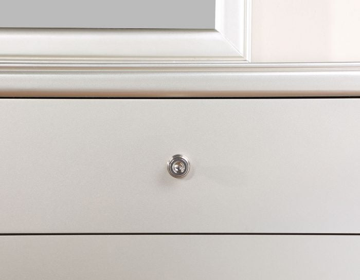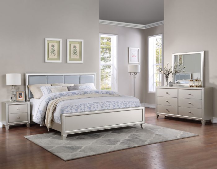 A glamourous package sure to add sparkle to any bedroom, Omni features a lustrous champagne finish and nickel hardware in a luxe configuration built for discerning tastes. The King Bed features an upholstered leatherette headboard that is stylish and comfortable for nighttime reading. The channeled back and gray cover add a cool sense of style to this luxurious bedroom set.
