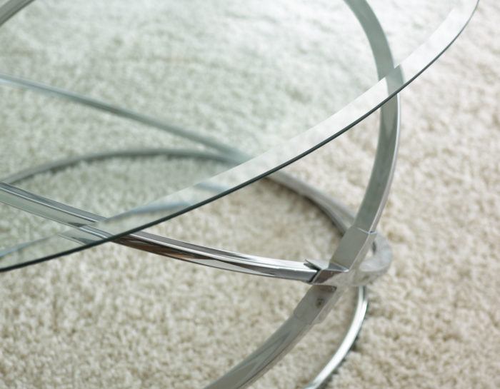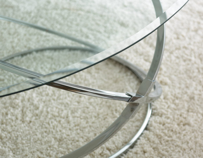 Contemporary styling in a living room in a box, Orion offers a visual striking display of chrome and glass. The chrome base snakes around in poetic movement beneath the glass table for all your guests to enjoy. Containing two End tables and a cocktail Table, the Orion is easy to assemble and display! An easy and inexpensive way to instantly change the look of your living room.