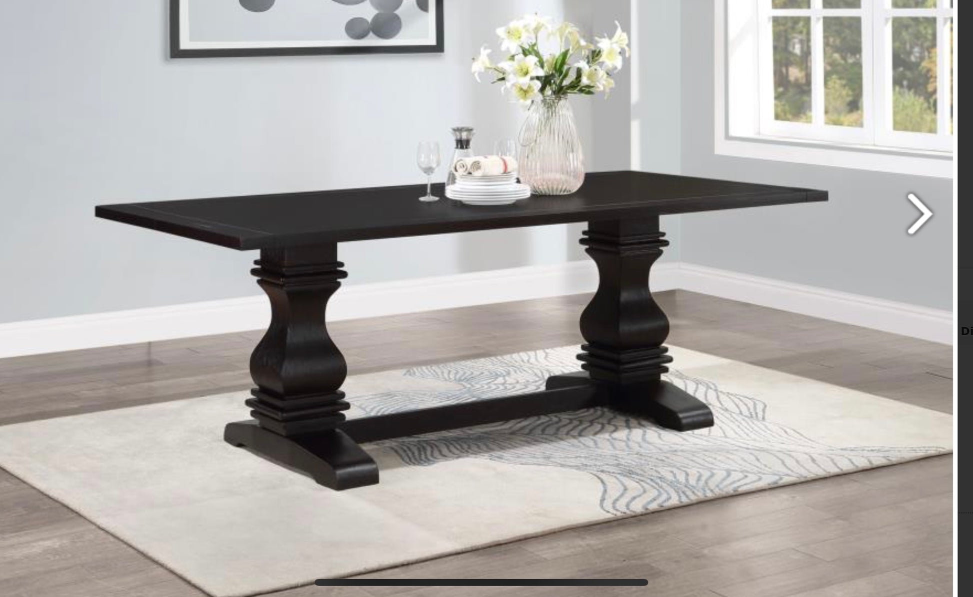 - Family sized dining table has a fixed top and stout pedestal columns