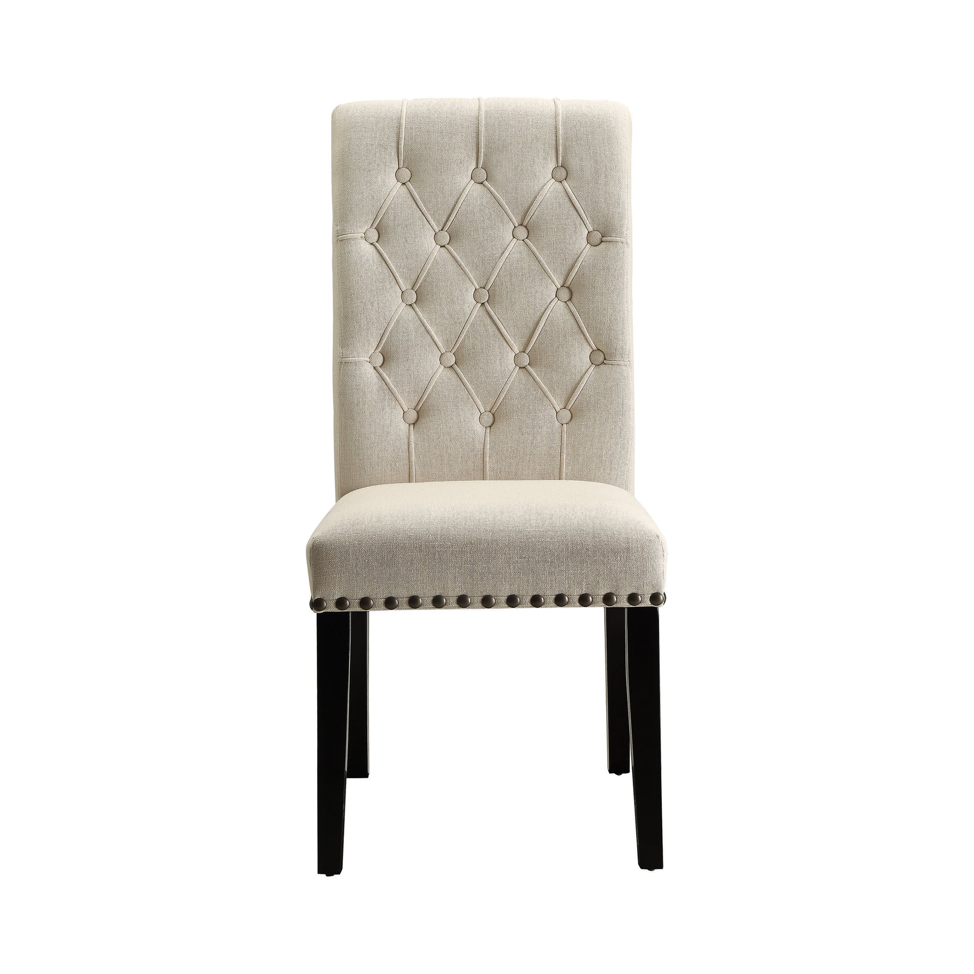 Airy elegance adds a charming touch in a semi-casual space. This dining chair celebrates style with a lovely cream fabric upholstery. Linear design offers an armless profile with tapered legs. A tufted seat back and nailhead trim build its personality with a touch of character. Contrast created by deep finish legs shapes the decor allure of this exceptional dining chair.