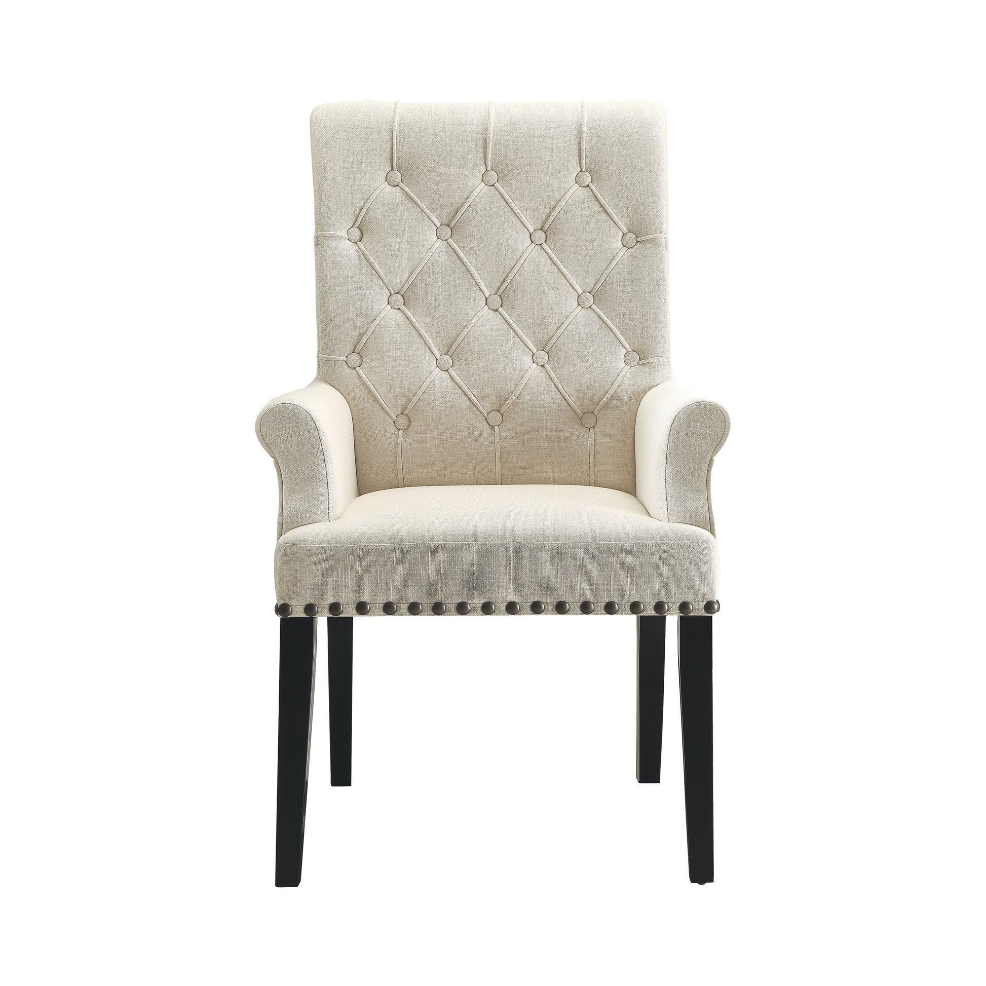 Seat guests in ultimate comfort. This dining armchair represents an artful upgrade to modernize a casual space while preserving traditional charm. Lovely cream upholstery infuses light and a fresh ambiance. Button tufting on its seat back joins sleek nailhead trim to add captivating accents. Dark finish legs provide the perfect contrast to complete a fabulous design package.Plushily padded arm and side chairs are adorned with rolled backs and button-tufted upholstery with bold nailhead trim