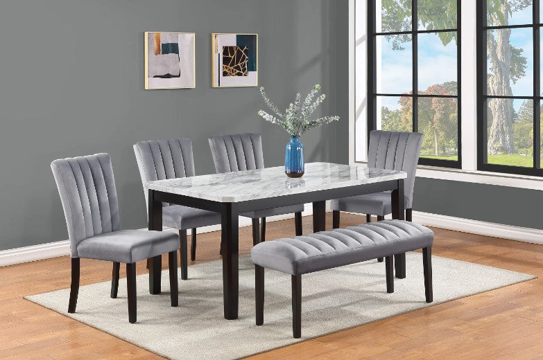Arm Chair Info: Black finish on the table, bench, and dining chair's legs, with a white finish on the faux marble table top and grey fabric upholstery on the bench and dining chairs