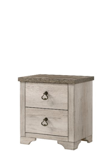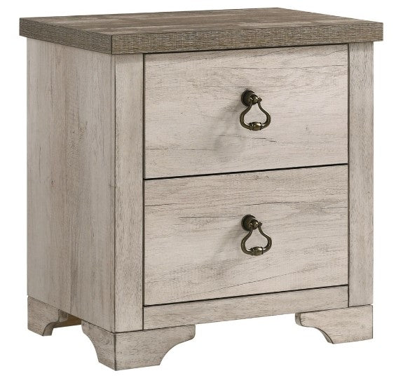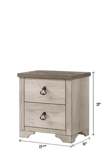 Create the perfect coastal cottage bedroom with the Patterson Nightstand from Crown Mark. This gorgeous nightstand is made out of reclaimed woods, hardwood solids, and veneers with a light and airy driftwood grey finish. The distinctive two-tone finish is highlighted by antique inspired hardware, as well as weathered plank tops and bracket feet. The metal ring pull hardware adds a beautiful brass-colored finish to complete the romantic look and feel. The Patterson Nightstand is designed to last with its durable construction, making it a timeless addition to any bedroom.