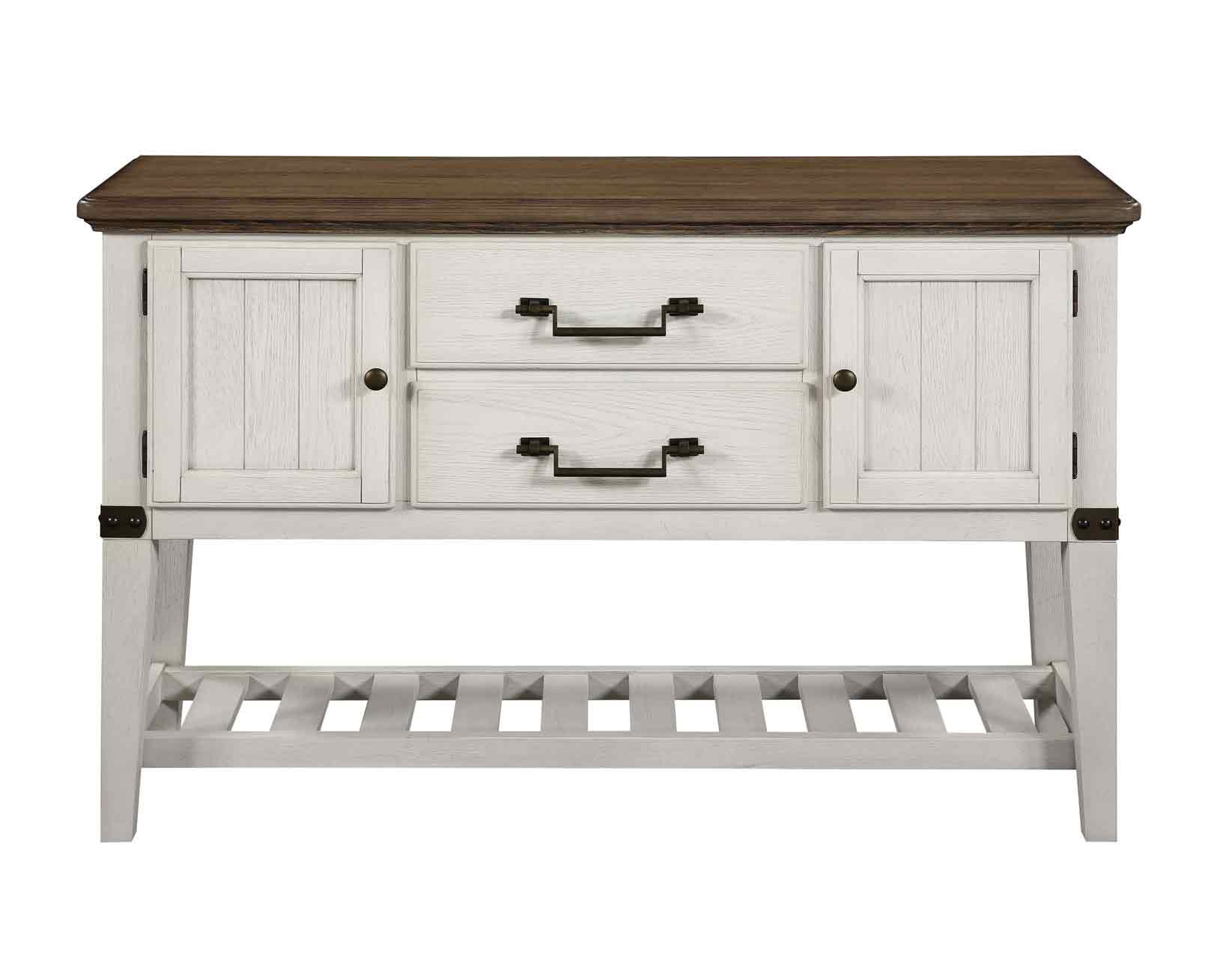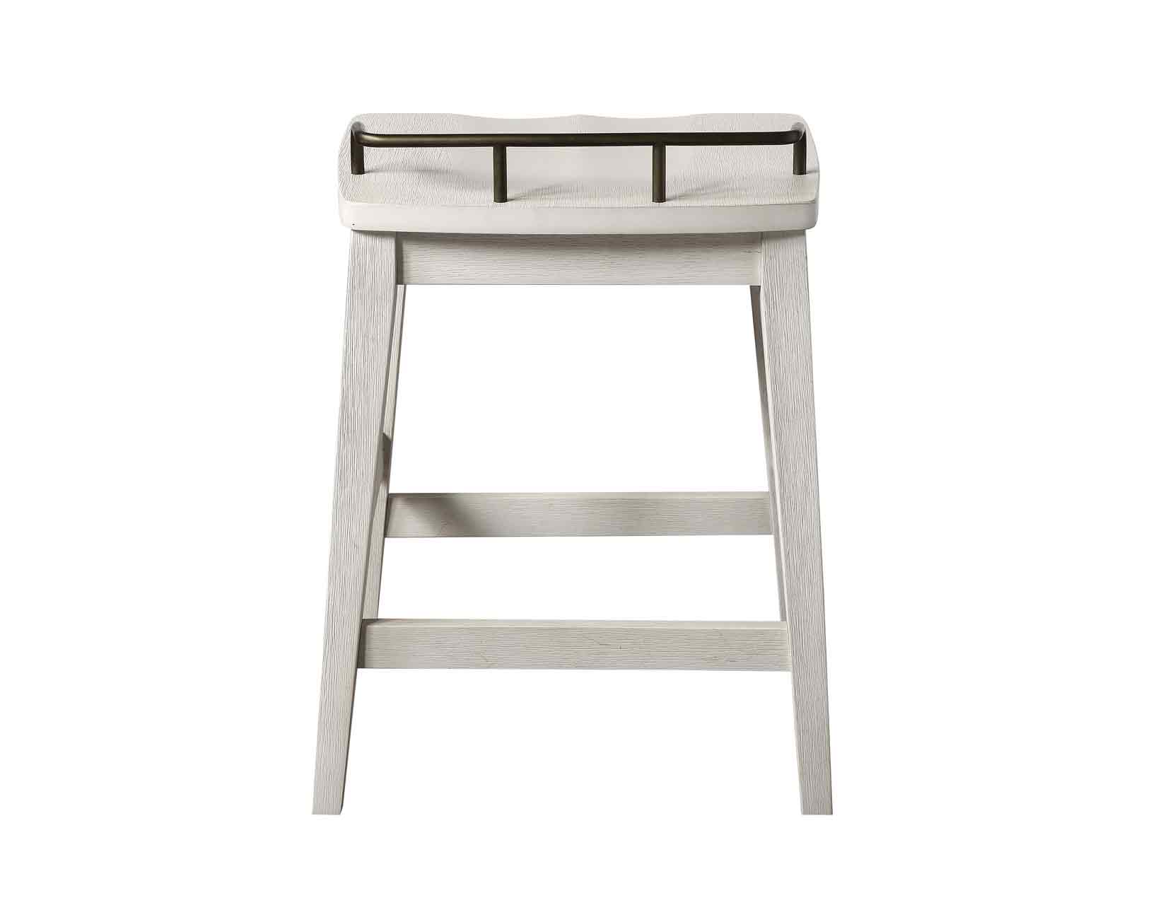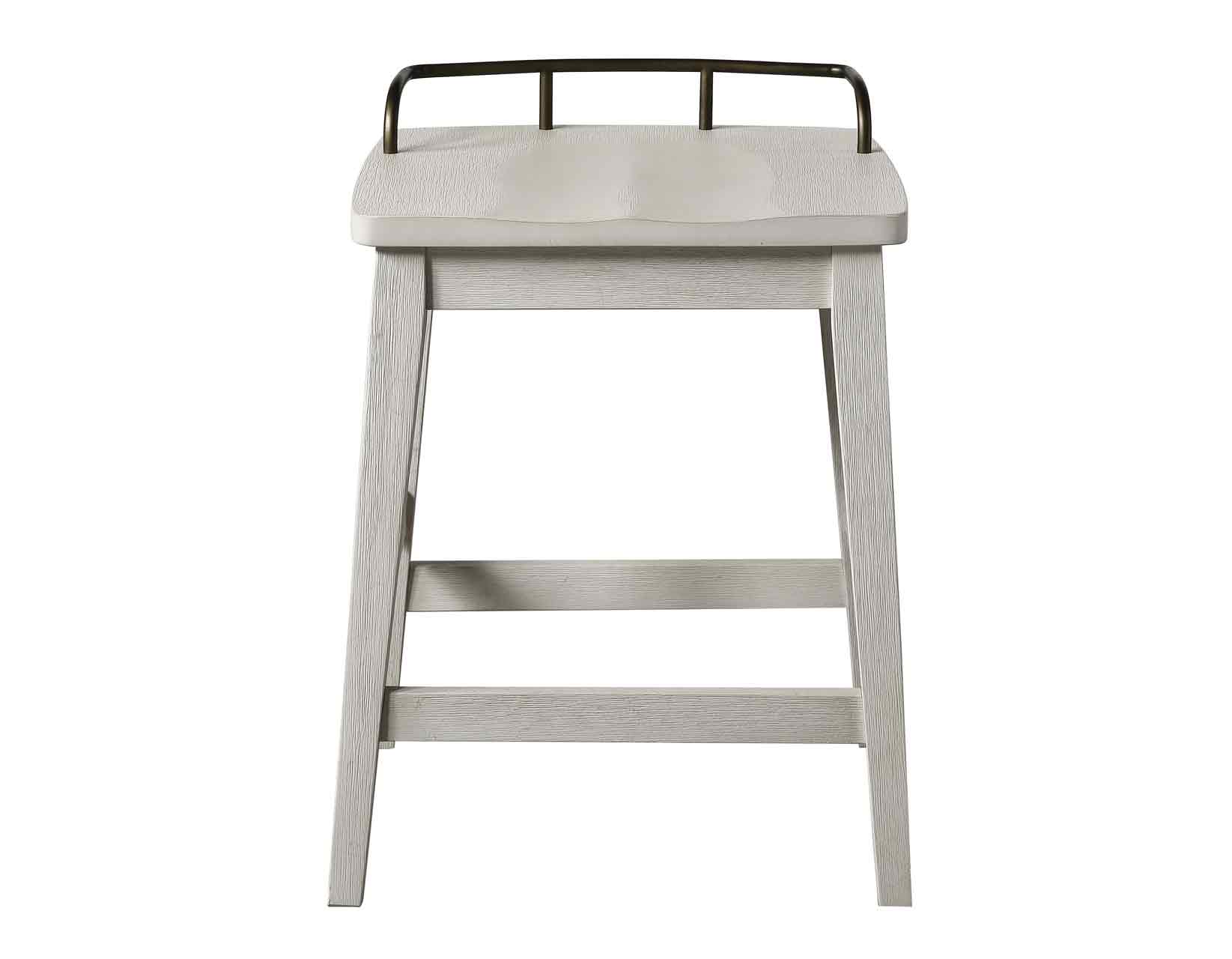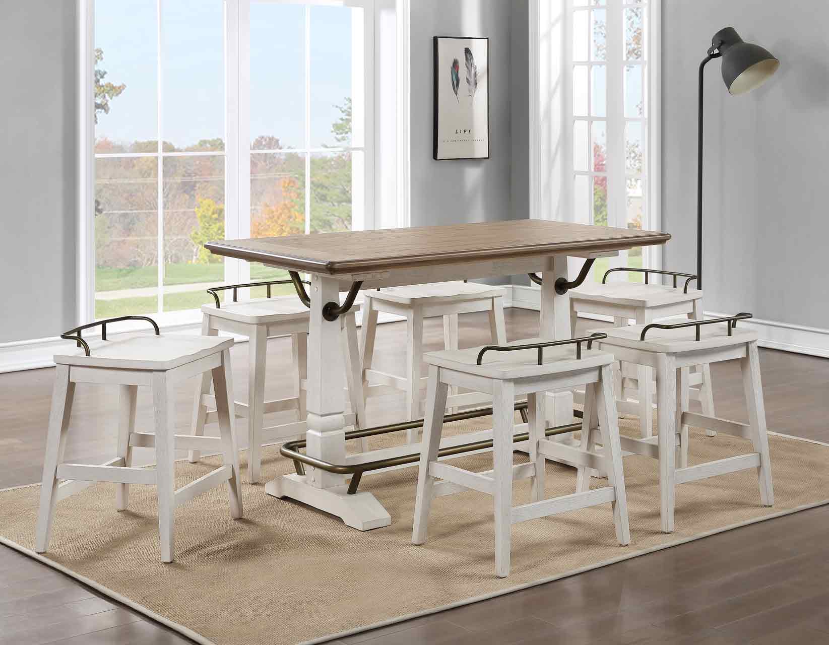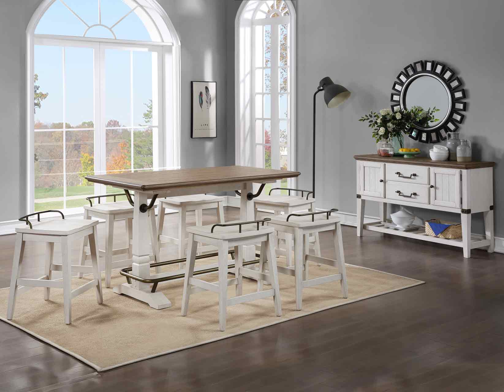 Classic design in a heritage farmhouse style, the Pendleton Counter Height Dining Set features a warm tow-tone finish enhanced with oil-rubbed brass metal accents. The 59.5 inch table seats up to six and features a double pedestal table base and saloon-style galley footrail that adds heirloom charm to the vintage style of the collection. The 24-inch height Counter Stool has a matching galley rail with a shaped seat and stretchers for added comfort. An optional Server completes the look and adds much needed storage to any dining area.