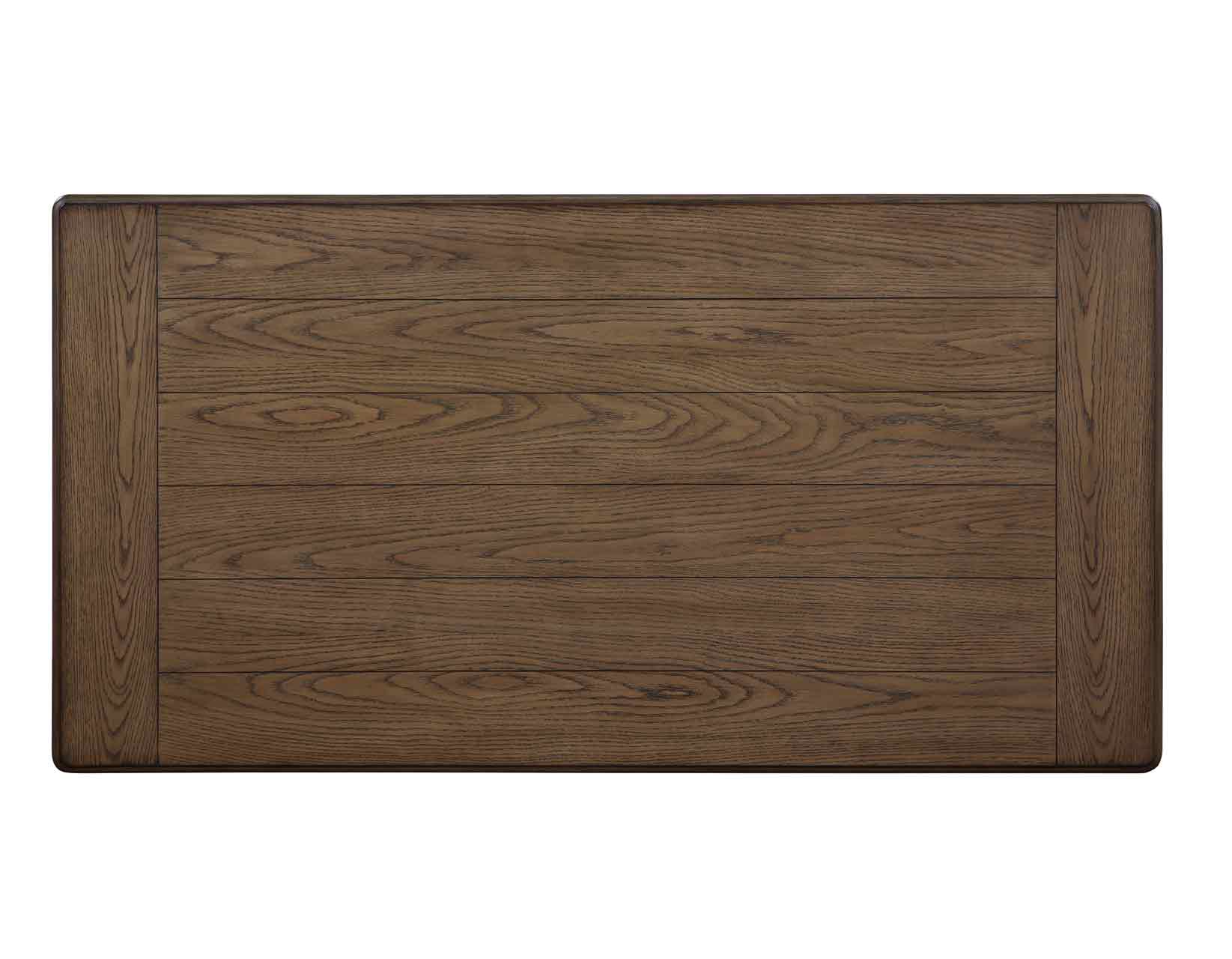 - Styling details include plank-effect tops, double pedestal table base, metal galley rails and tapered legs