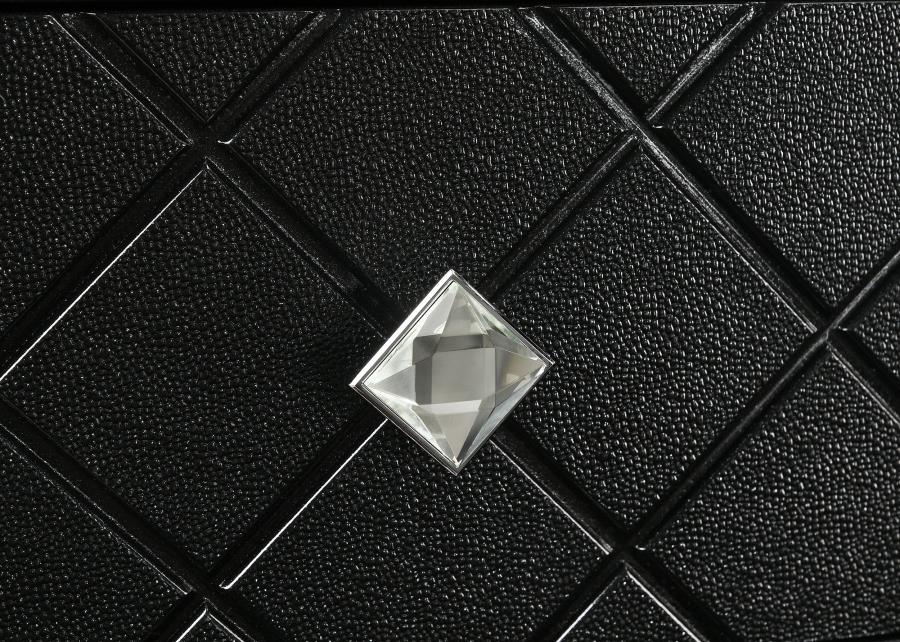 Glitz and glam will overtake your sleeping space with this incredible black dresser. Six drawers display embossed panels with a geometric pattern. The diamond-style acrylic hardware makes for an incredible and elegant upgrade for this contemporary piece. A spacious tabletop brings plenty of space to display decorative items and bedside essentials. Enjoy years of durability and beauty from this piece, crafted from quality Asian hardwood.