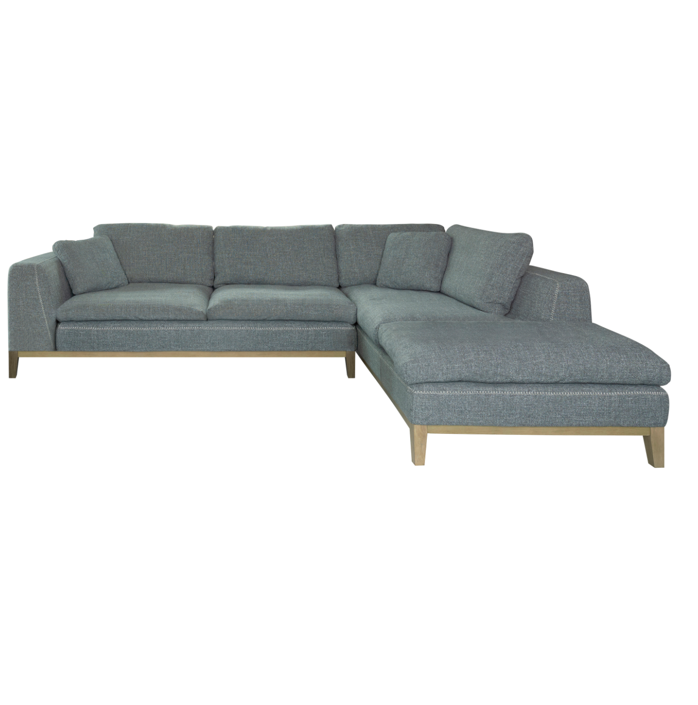 - This low profile 2-piece sectional is exceptionally tailored in a textured grey fabric accented with contrast blanket stitching in beige