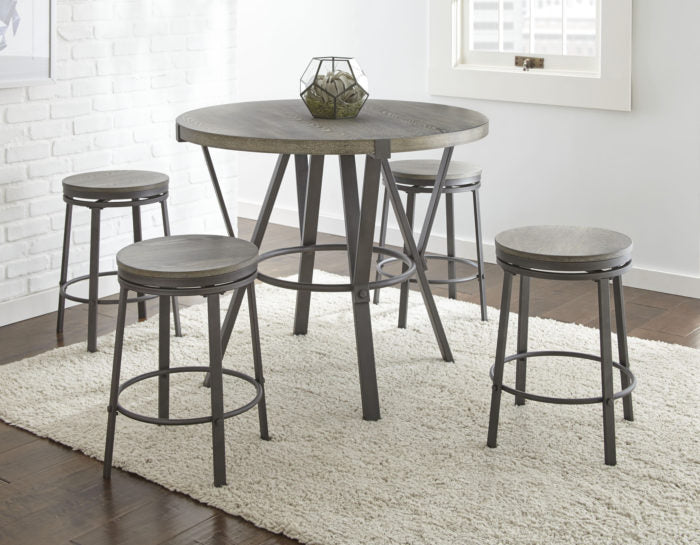 Mixed media counter set with compact design and stylish gray finish. Portland features swivel counter stools with stretchers for added strength and comfort and the round dining table fits well in any dining setting.
