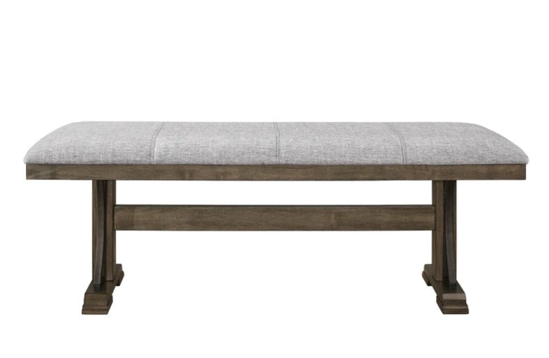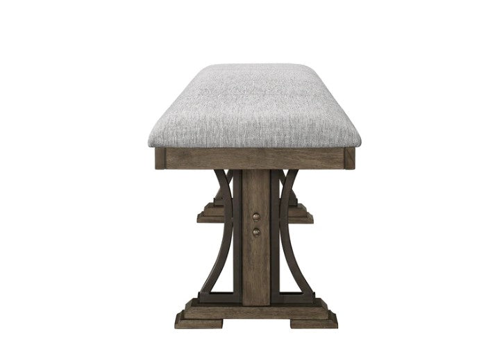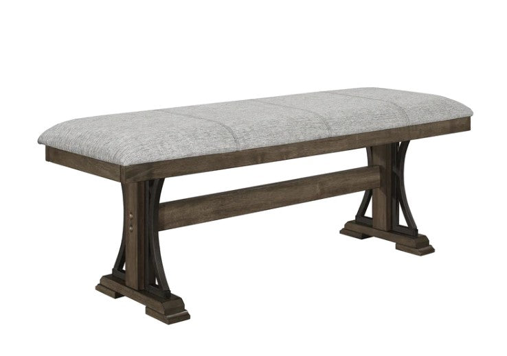 Perfect for a breakfast nook or informal dining area, this dining set keeps the room casual. The rectangular table and matching bench have trestles bases supported by curved metal accents. The four classic side chairs are a wonderful complement with slat backs and upholstered seats.