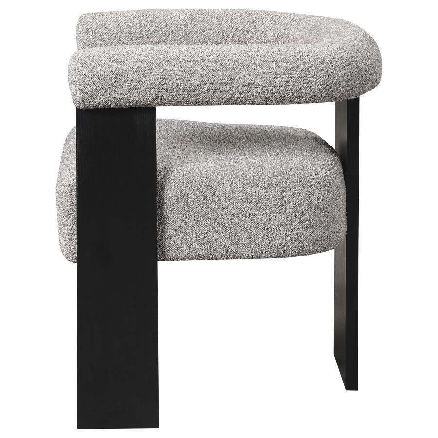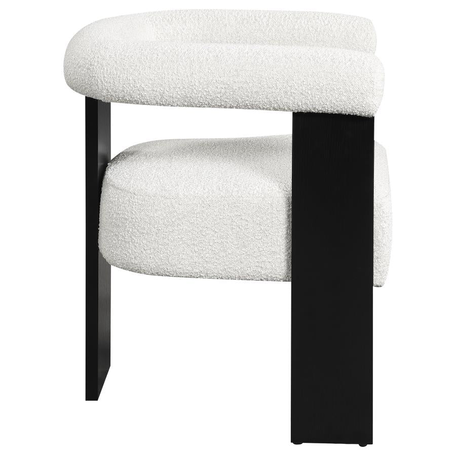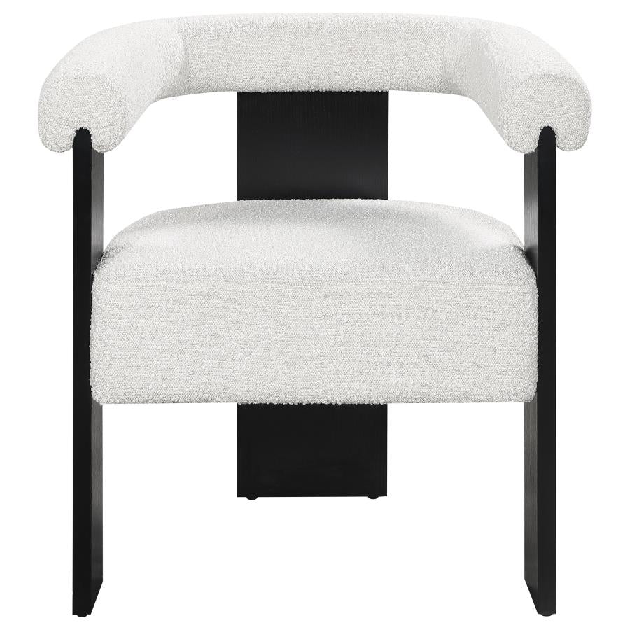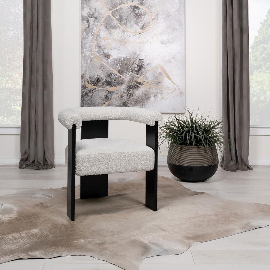 In a harmonious marriage of materials, this chair presents bouclé's softness against the stark, bold lines of a dark wooden frame. The upholstery's tactile pleasure complements the frame's visual strength, offering a seat not just made for comfort but for admiration. Its unique shape—a modern take on classic forms—creates a striking silhouette that invites you to experience design as much as repose. The mix of media is a testament to the chair's thoughtful design, where every curve and corner is an intentional contrast, an invitation to touch, to rest, to enjoy.