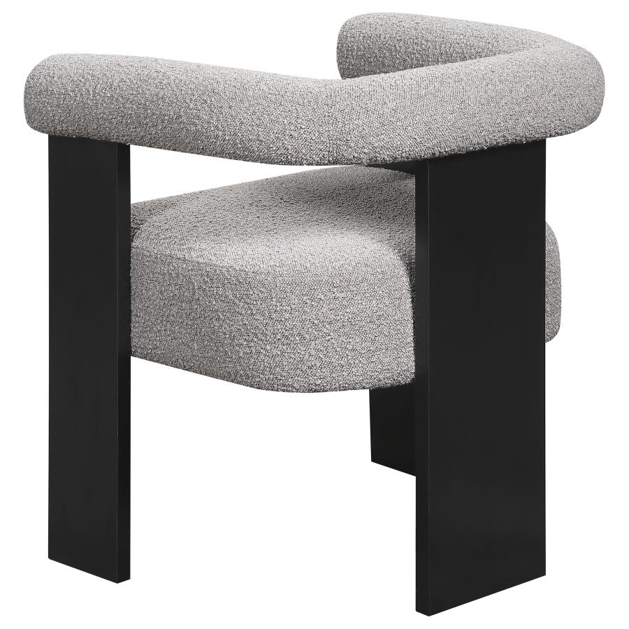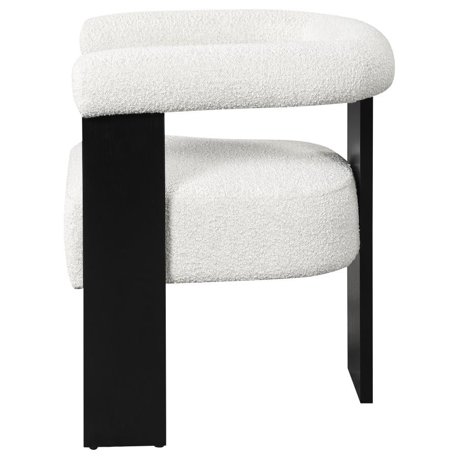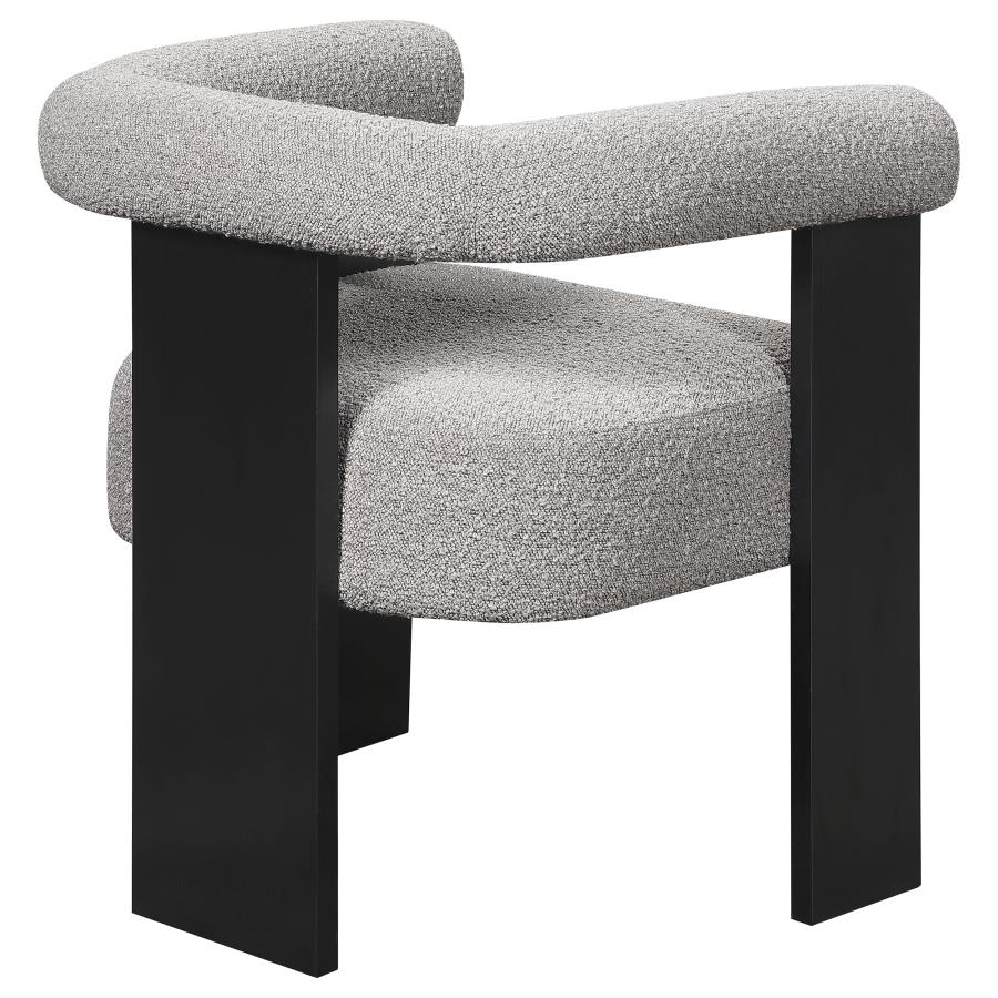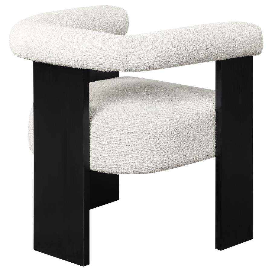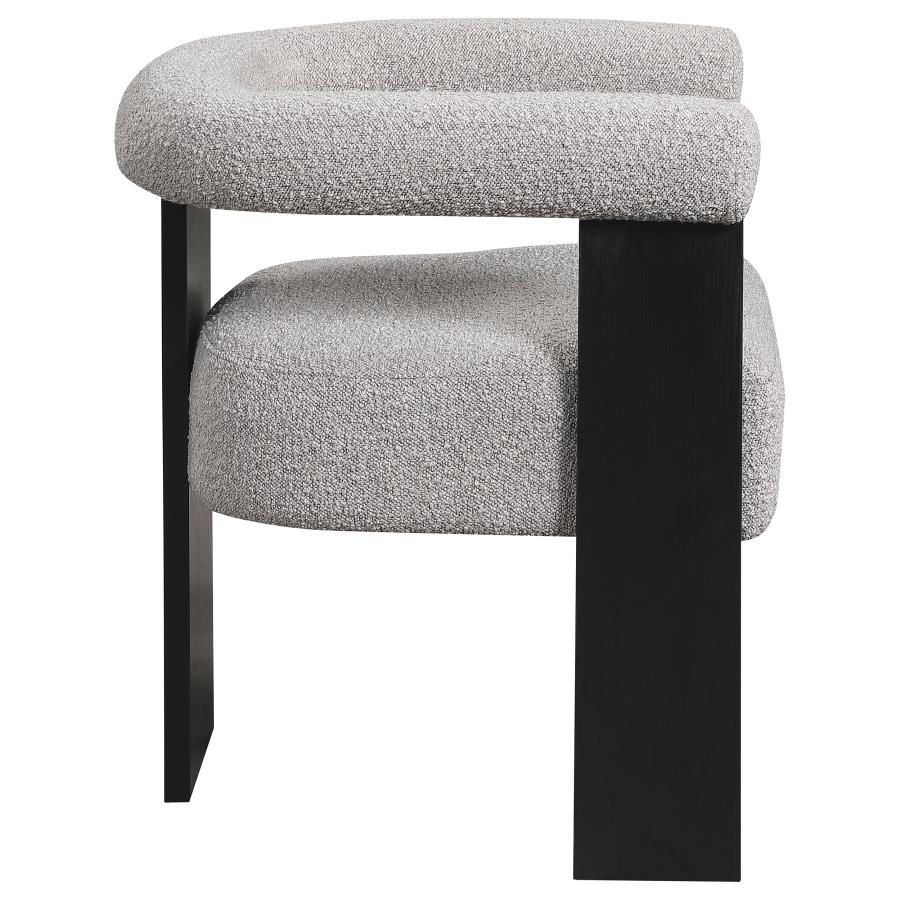 In a harmonious marriage of materials, this chair presents bouclé's softness against the stark, bold lines of a dark wooden frame. The upholstery's tactile pleasure complements the frame's visual strength, offering a seat not just made for comfort but for admiration. Its unique shape—a modern take on classic forms—creates a striking silhouette that invites you to experience design as much as repose. The mix of media is a testament to the chair's thoughtful design, where every curve and corner is an intentional contrast, an invitation to touch, to rest, to enjoy.