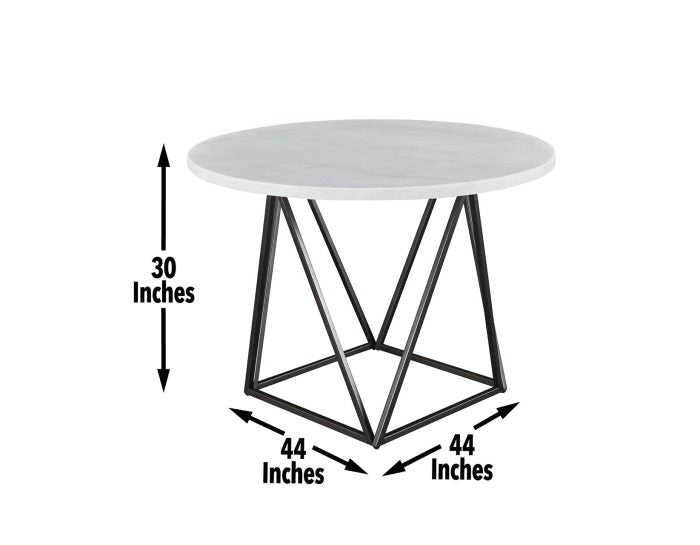 - Table styling features include beautiful round white marble top combined with a powder-coated dark bronze iron base with architectural angles