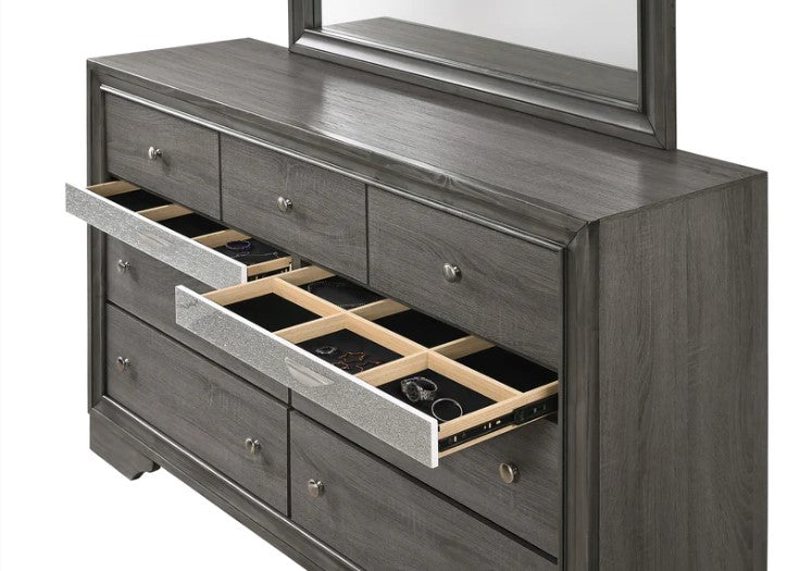 Crown Mark Furniture presents the Regata Dresser in Gray The Regata is a high-quality piece of contemporary furniture made of woods and solids with a beautiful gray finish. This dresser has hidden drawers on case pieces that are camouflaged by silver panels. It also has dovetail drawer construction with Kenlin metal drawer glides for smooth, effortless operation. The Regata Dresser would be a perfect addition to any bedroom, providing ample storage for all of your clothes and accessories. Order yours today!