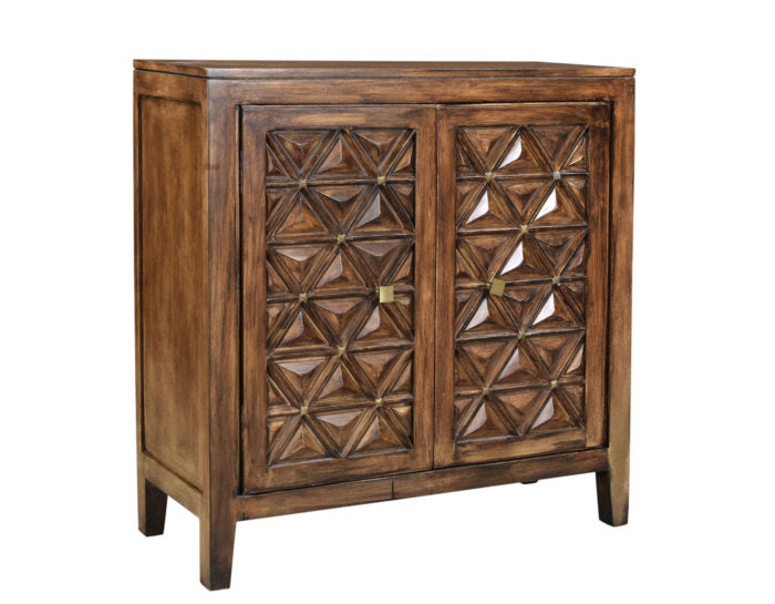 The Regent Accent Cabinet has the look and feel of a time-worn antique with the performance of a modern-day hand-crafted furniture piece. This solid wood cabinet features hand-carved geometric relief doors with gold metal accents that are striking in their detail and beauty. The unique style and burnt umber will complement interior styles from eclectic to traditional.