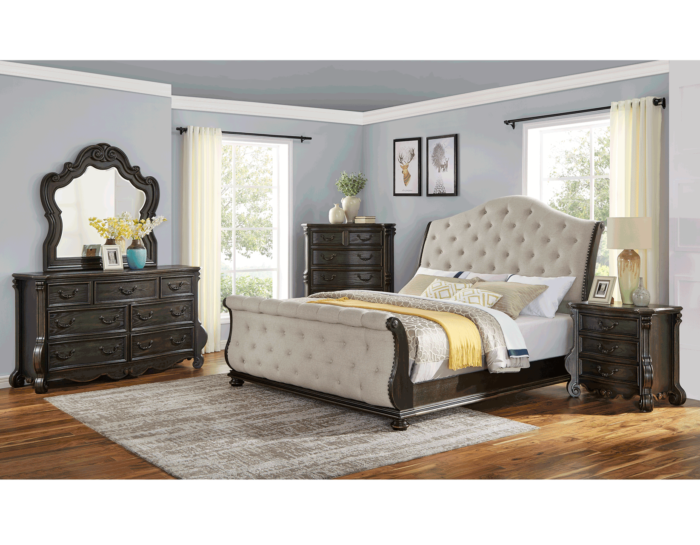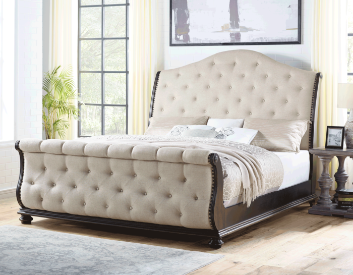 - Styling details include button tufted headboard and footboard with scalloped, scrolled headboard, scrolled feet.