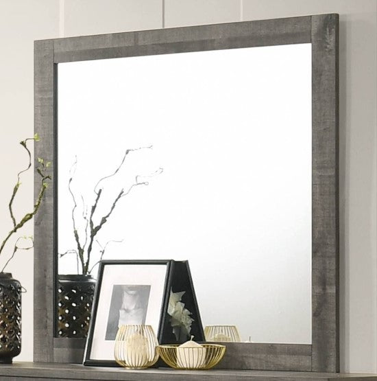 This transitional styled Rhett Dresser Mirror from Crown Mark Furniture is a great addition to any bedroom or furniture set. With a greyish brown color, the mirror is constructed from wood byproducts and features a flat wooden frame and a distressed finish. This simple and clean design offers a timeless look, while the durable construction ensures lasting performance. Enjoy the mirror's landscape design and experience the charm of this classic piece in your home.