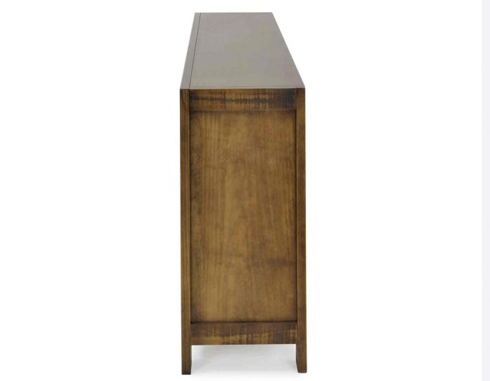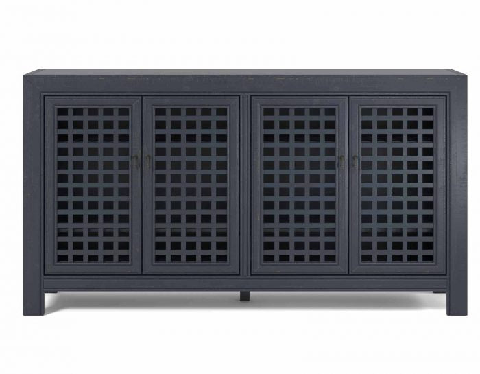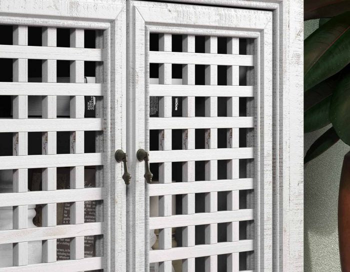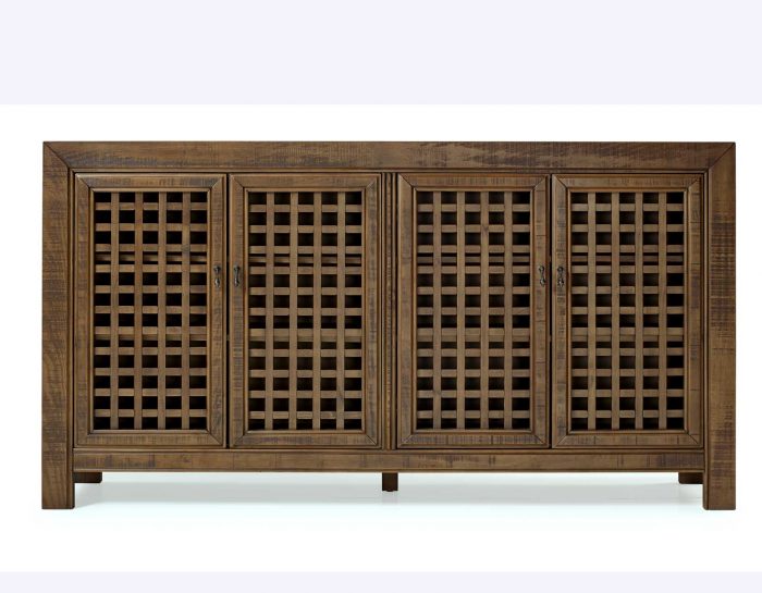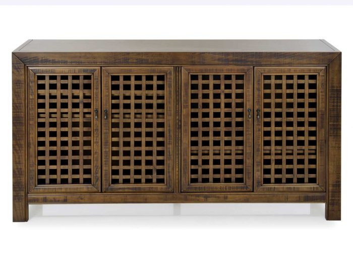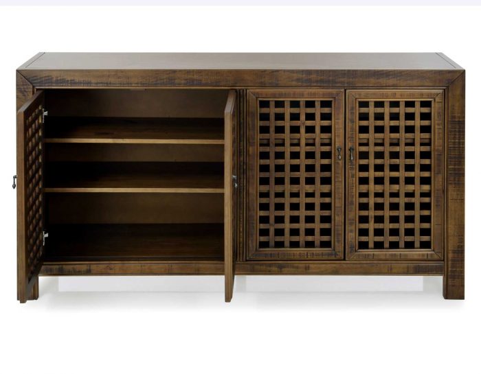 An Accent Cabinet with an heirloom feel and antique pie-safe design, the Rio 4-Door Cabinet is built for today’s home accents and electronics. The 70-inch long cabinet has four adjustable shelves and lattice door fronts for semi-open display or for electronic remote use. A beautiful powder gray finish warms the room while the four adjustable shelves ensure you configure the piece exactly to your own specifications.