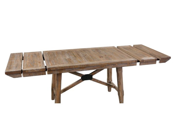 This Rustic Ranch table makes a great centerpiece to any casual dining setting. This table is built to seat all your family and friends with two-12 inch leaves that insert on the outer leaves to expand the table72 to a full 96 inches with seating for up to 10. The railroad tie base stretchers add look and strength to the table base and complement the saw-rasping distressing that will make the table fit in settings from the plains to the city.