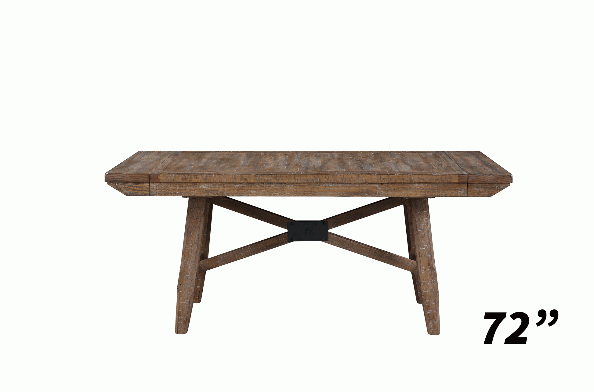 Rustic Ranch styling in a distressed dining package that is built to fit a large crowd. The dining table expands to a full 96 inches with two 12” leaves inserted and seats up to 10. The table is heavily distressed with saw rasping for an heirloom feel and a delightfully casual appearance, The driftwood finish will blend with many decors and complements the beige upholstered chairs perfectly.