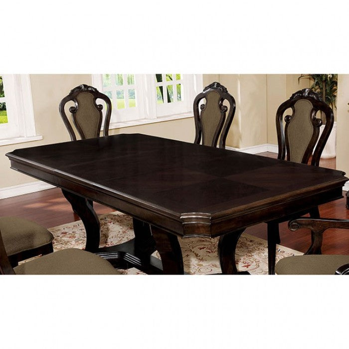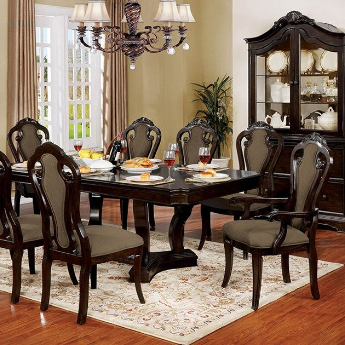 The heart of every home is the kitchen, and the dining room is an extension of that. After pouring your time and love into your home cooked meals you should serve in on a dining set worthy of your hard work. This is just that set. It's excitingly modern but grounded in traditional design. Walnut finished wood is curled and carved into an exquisite shape. A trestle base, clipped table corners, and carved details deliver a positively delightful table.
