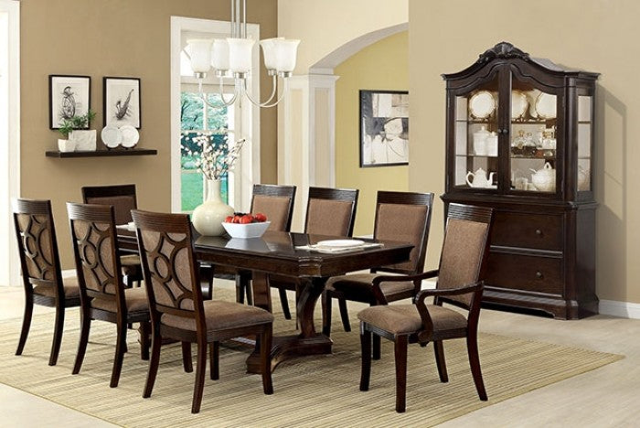 The heart of every home is the kitchen, and the dining room is an extension of that. After pouring your time and love into your home cooked meals you should serve in on a dining set worthy of your hard work. This is just that set. It's excitingly modern but grounded in traditional design. Walnut finished wood is curled and carved into an exquisite shape. A trestle base, clipped table corners, and carved details deliver a positively delightful table.