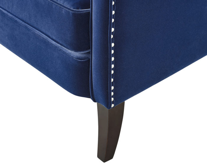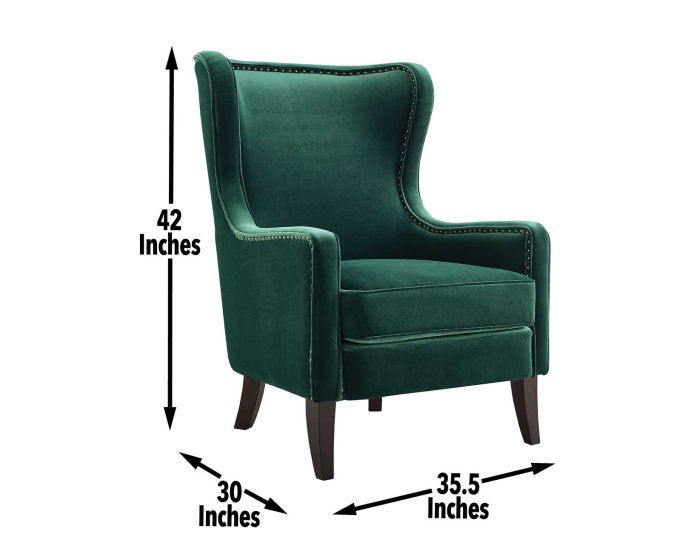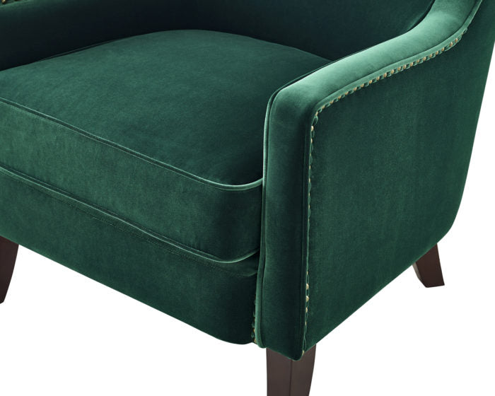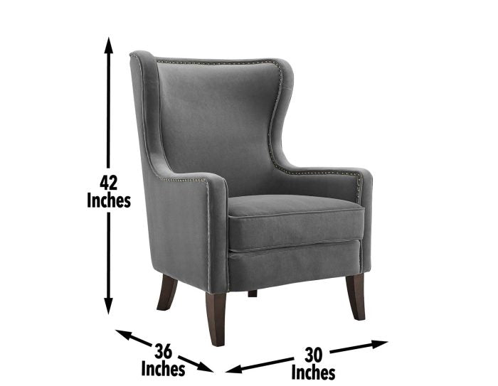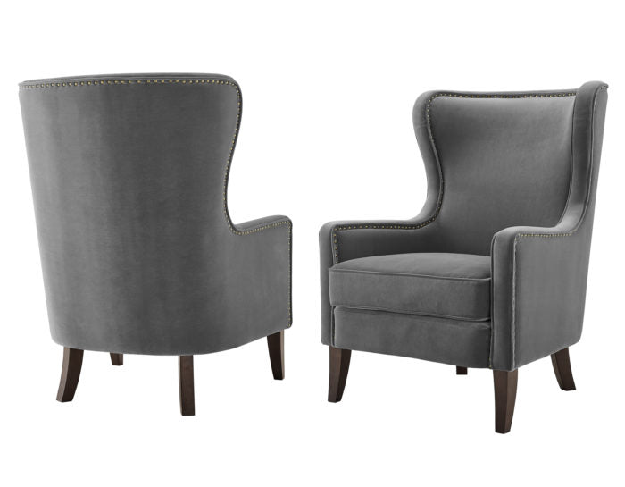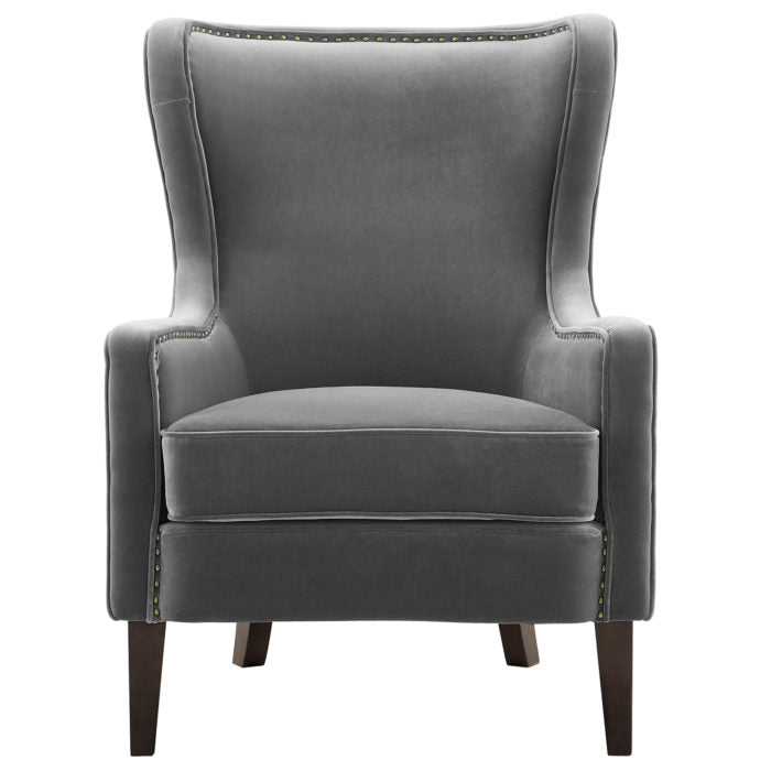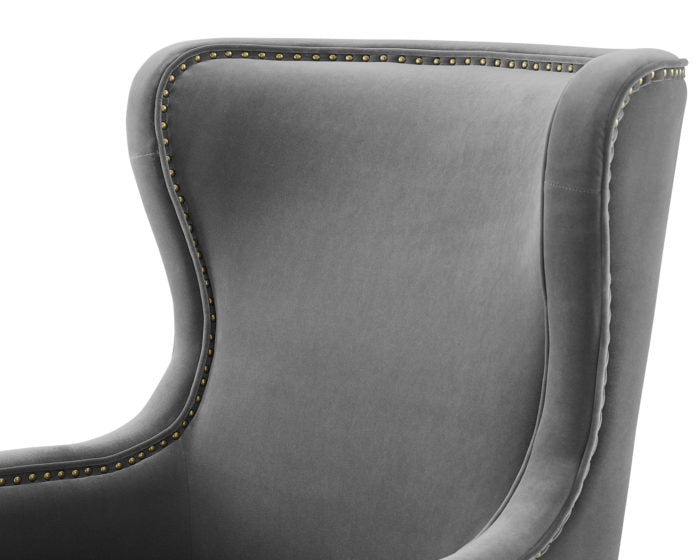 Rosco presents a modern take on classic wing-back chair styling. This silohouette comes in three colors each with a nailhead trim that matches the style of the chair. The charcoal velvet chair shown here features softly curved angles and brass nailhead trim that warms the profile up while lending a soft vintage accent to the chair. Tapered legs in mocha finish complete the look.