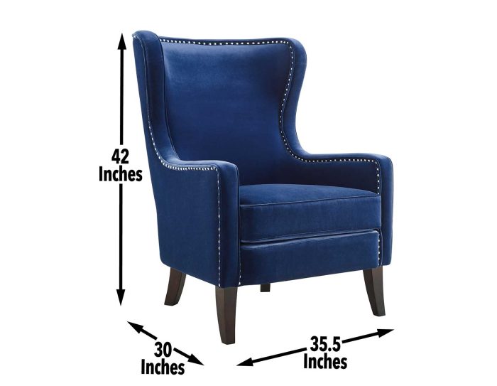 - Styling details include wing-back design with modern touches and soft curves, tapered solid legs and loose seat construction with brass nailhead trim