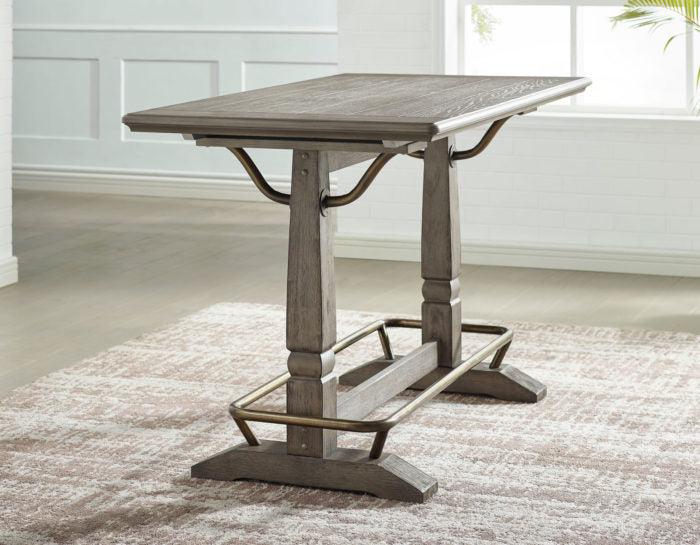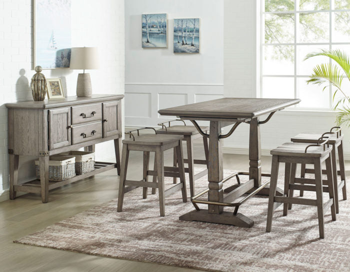 Ryan presents stylish, rustic counter dining is built for the way we live today. A smoky oak finish is paired with antiqued brass hardware and galley rails to create the feel of a time-worn antique. The Counter Dining set features Counter Stools that are casual and comfortable and work well with the table or at a separate counter area. The Counter Table would not be out of place in an old Western saloon but also looks great in today’s modern homes.
