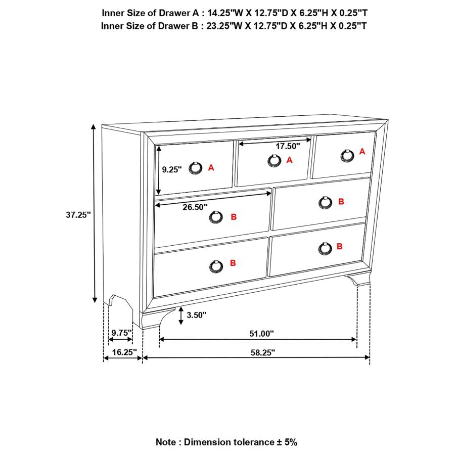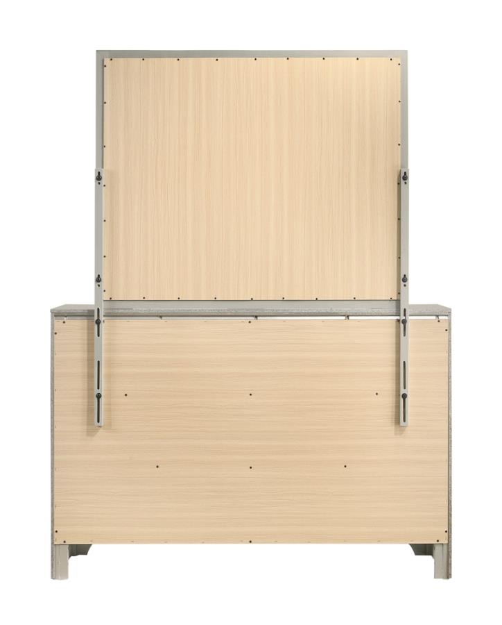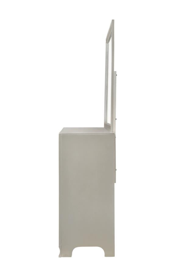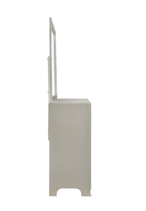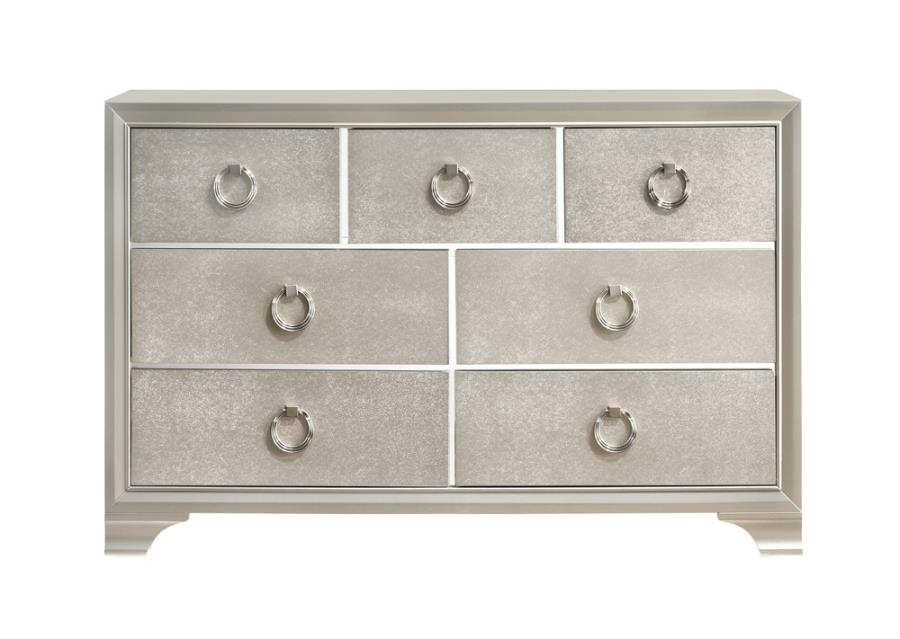 Update your space with tasteful, transitional glam style. This stunning, eight-drawer dresser boasts a sparkling metallic sterling finish that brings vibes of modern elegance to any bedroom. Acrylic mirror accents enhance its simple silhouette with a brilliant touch of shine. Oversized ring drawer pulls add a dramatic accent to its design. With ample storage space and felt-lined top drawers, this gorgeous wood dresser has all you need to create a stylish and organized living space.