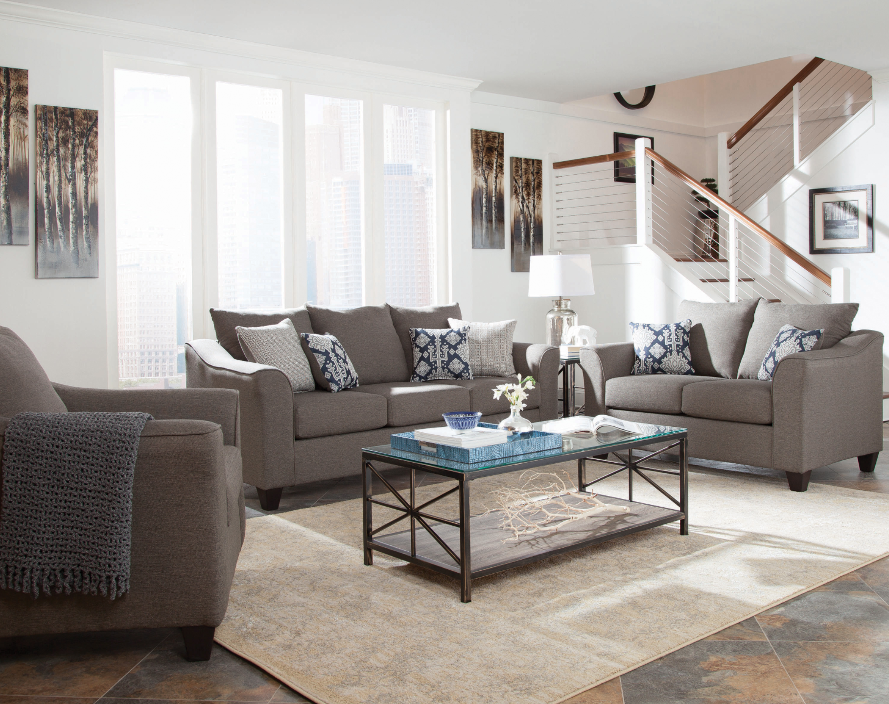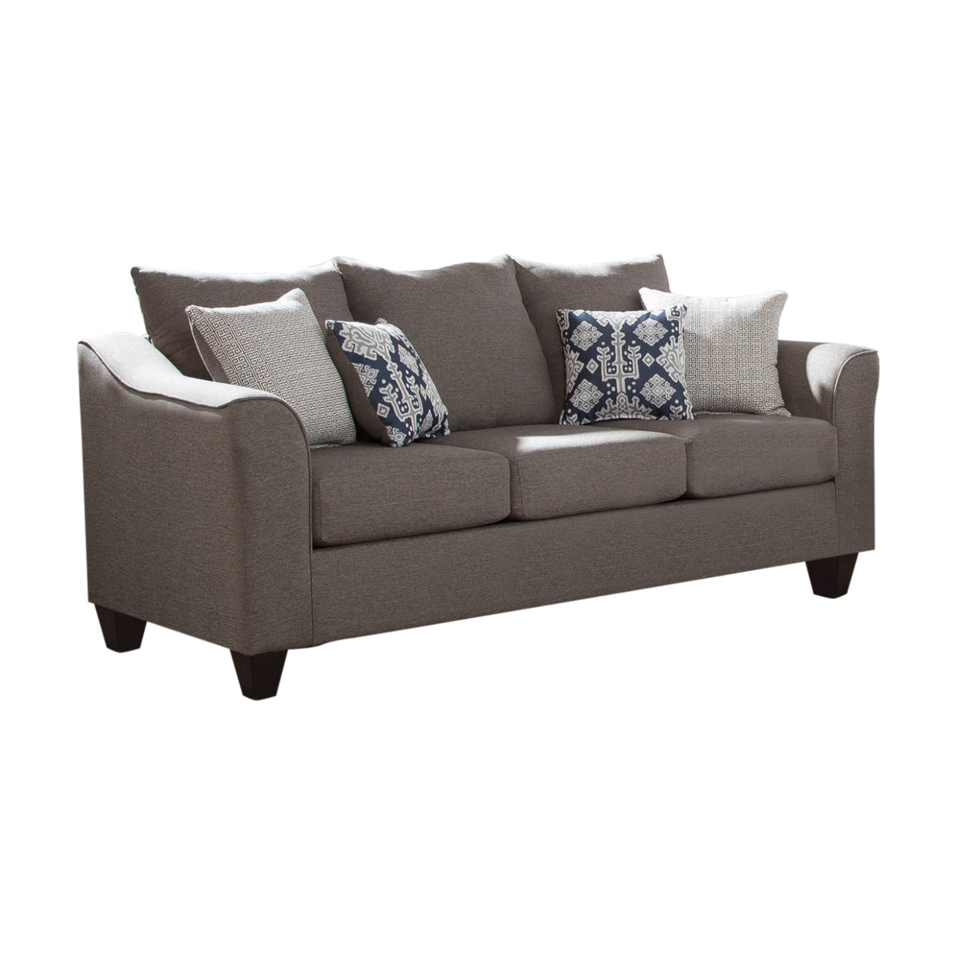 Elevate a living room with casual style and subtle sophistication. This classic sofa boasts a simple silhouette enhanced by elegant, flared arms. Neutral, warm grey upholstery lends a touch of subdued glamour. High-density, full-foam cushions offer an exquisite level of comfort. Complete with contrasting accent pillows, this sofa has all you need for day after day of cozy relaxation.