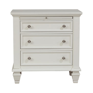 The Sandy Beach collection presents this coastal style 5-piece bedroom set that offers an enduring appeal. The headboard and footboard of the bed have detailed carved panels for a touch of classic distinction. The three-drawer nightstand has a handy pull-out service tray, while the ten-drawer dresser includes two doors that open up to six of the and room on its broad top to easily accommodate the square mirror. The chest features six deep drawers for additional storage space. The entire set is fashioned from maple veneers with a stunning buttermilk finish (classic black finish is also available).