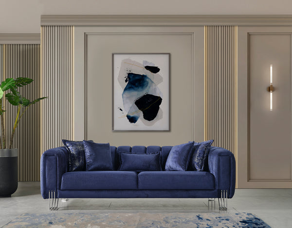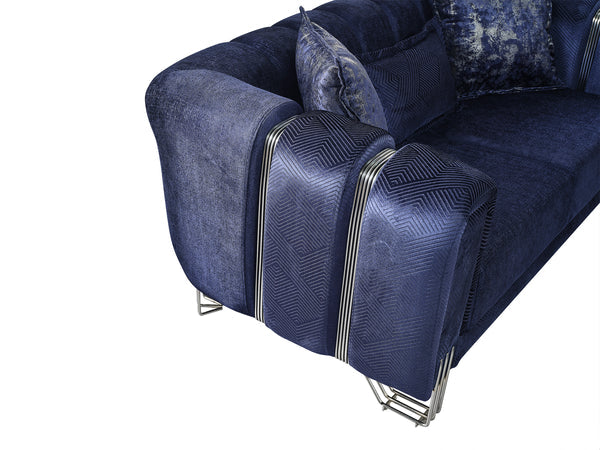 Introducing the luxurious "Santana" sofa and loveseat set, a harmonious blend of style and comfort that will transform your living space into a haven of elegance. The front parts of the arms are adorned with a specially designed velvet fabric, adding a unique touch of sophistication. Meanwhile, the backrest and seating area feature a sumptuous plain rich velvet, providing a smooth and indulgent seating experience. Both arms of the Santana set are gracefully embraced by an arch design. Enhancing the set's overall aesthetic, the Santana set is supported by stainless steel gold legs and comes with eight designer pillows.