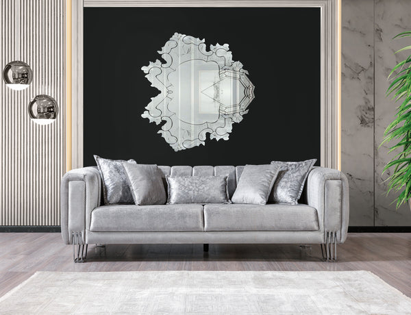 Introducing the luxurious "Santana" sofa and loveseat set, a harmonious blend of style and comfort that will transform your living space into a haven of elegance. The front parts of the arms are adorned with a specially designed velvet fabric, adding a unique touch of sophistication. Meanwhile, the backrest and seating area feature a sumptuous plain rich velvet, providing a smooth and indulgent seating experience. Both arms of the Santana set are gracefully embraced by an arch design. Enhancing the set's overall aesthetic, the Santana set is supported by stainless steel gold legs and comes with eight designer pillows.