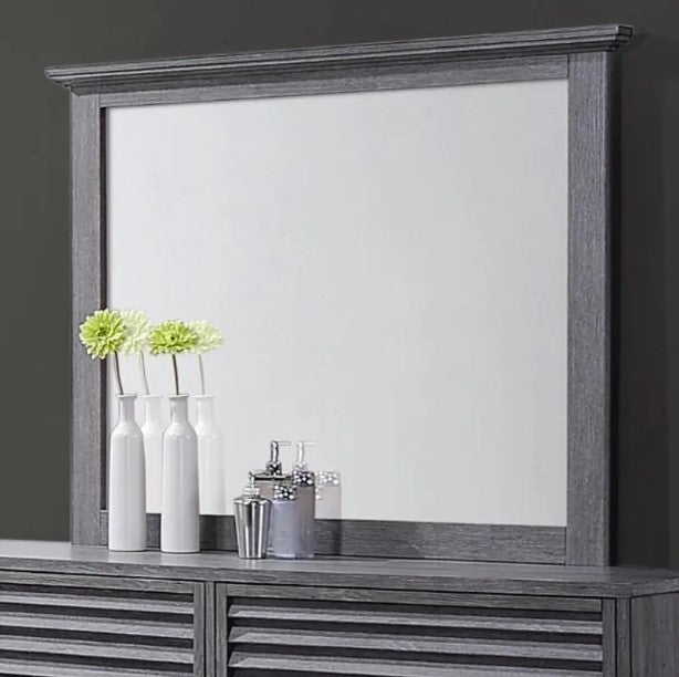 The Sarter Dresser Mirror from Crown Mark Furniture is the perfect addition to any bedroom. The transitional style gives this mirror a classic and timeless look, with a Beveled glass, simple wood frame design, and Weathered Gray finish that stands out. Constructed with solid wood and wood veneers, this piece is designed to be sturdy and long-lasting. The Grey color ensures that it goes well with any decor. Complete the look of your bedroom with the matching dresser from Crown Mark Furniture.