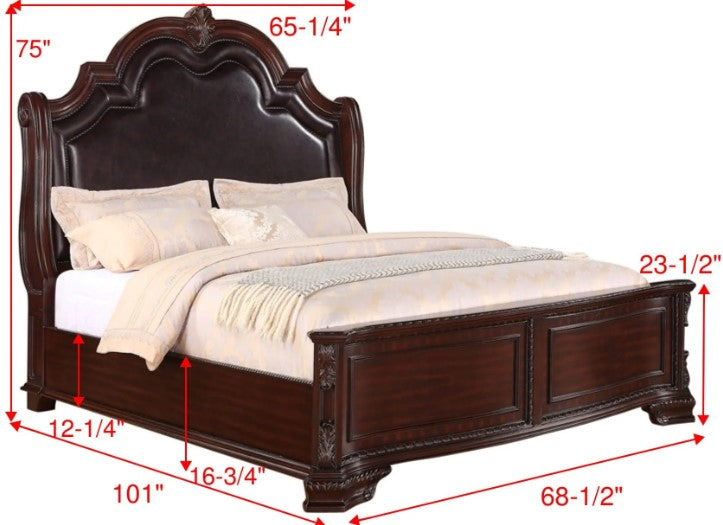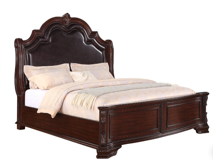 The Sheffield Panel Bedroom Set has sophisticated details ideal for a traditional style master bedroom. This bed features bracket feet, a leather-like upholstery headboard with nailhead trim, and intricately carved molding details that complete the look of the bed. Transform your master bedroom suite to one of luxury with this traditional style panel bed. Traditional elegance melds with today's modern home with the Sheffield Collection. Each piece is unique and full of rustic charm. The traditional styled panel bed is available in queen or king. It has upholstered headboard panels, stout, bracket legs, and matching side rails. The dresser has 9 drawers and the nightstand 3, both offering ample storage space. Traditional styling flows with the classic pilasters, paneled sides, raised drawer fronts, nickel-plated hardware, and decorative nailhead trim. The Sheffield Bedroom Collection is a perfect life-time partner to any home.
