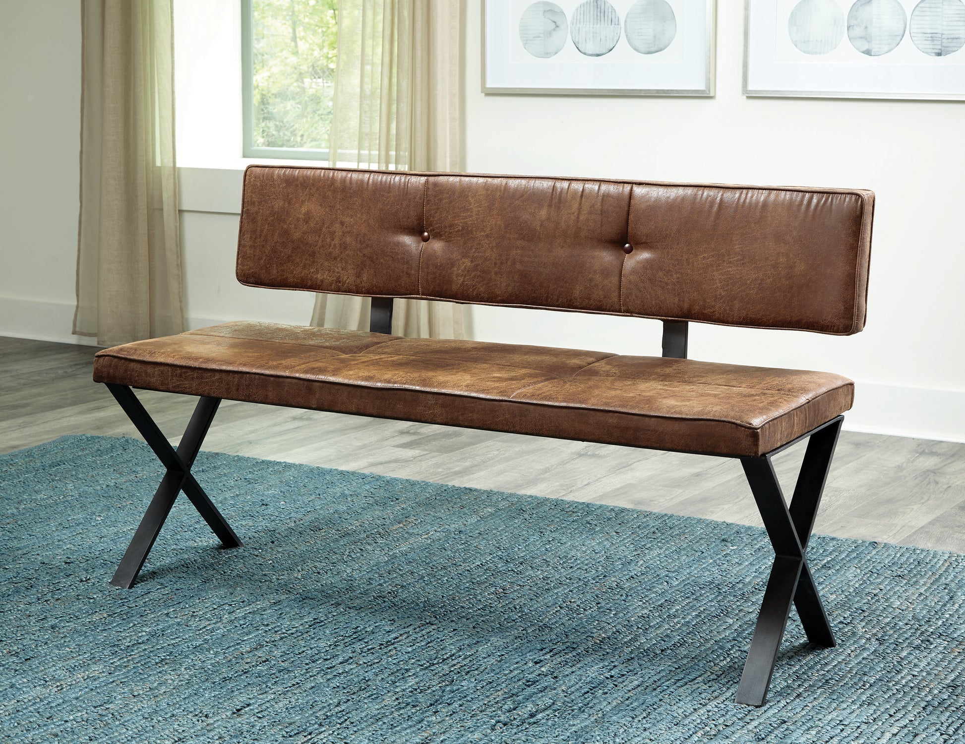 This gorgeous upholstered bench is crafted in warm tones and materials for a rustic appeal. It offers a vintage industrial allure from a warm, rich vintage brown leatherette and iron leg X-style base in a matte black finish. A cushioned bench seat provides loads of comfort. A padded back adds even more support so you can enjoy yourself without worry. This bench will be a favorite place to sit and enjoy large family gatherings.