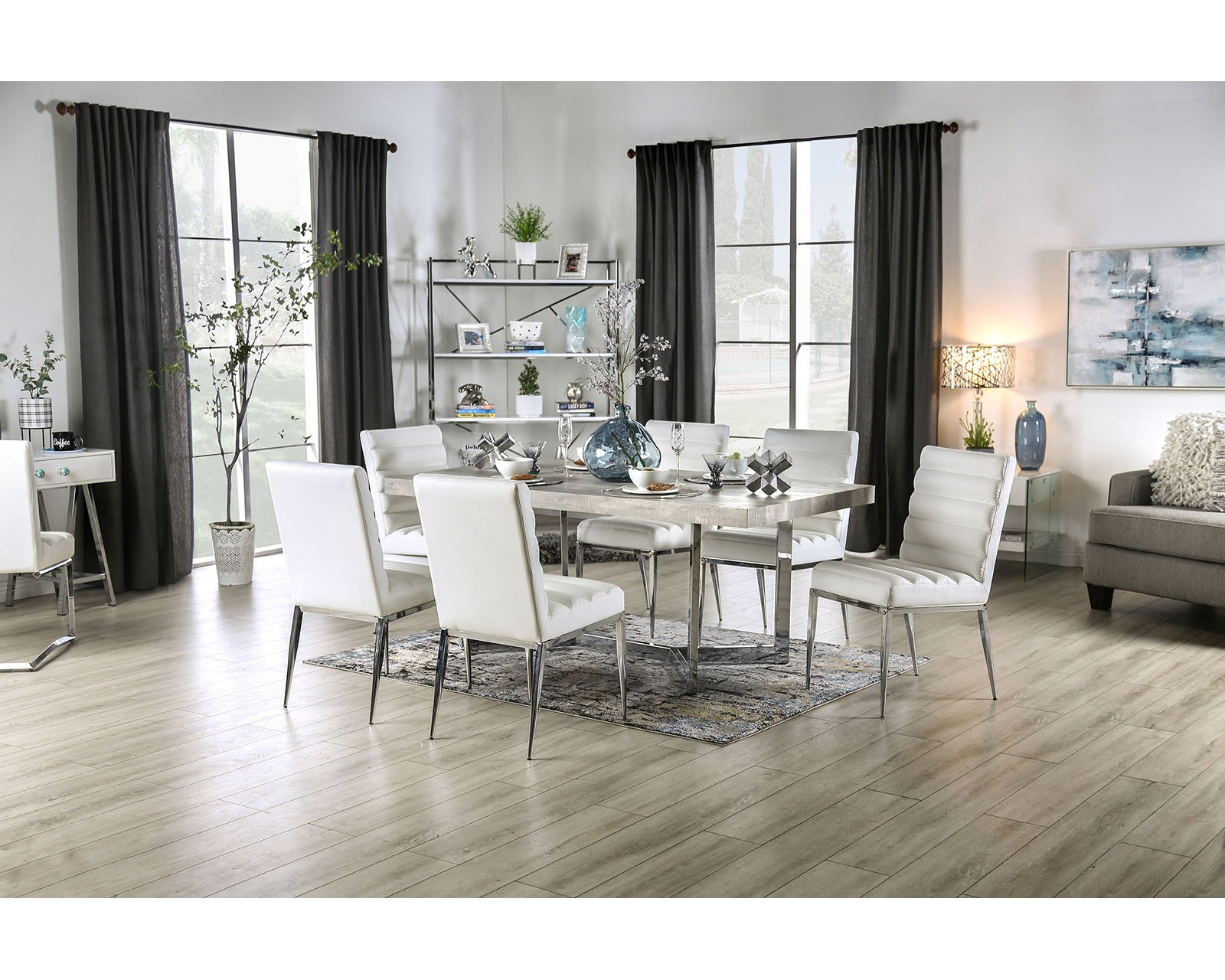 Uniquely designed closed chrome metal legs highlight this rectangular dining table with the gorgeous table top. When you want something that's a bit out of the norm, this piece fits the bill and is a wonderful addition to any room.